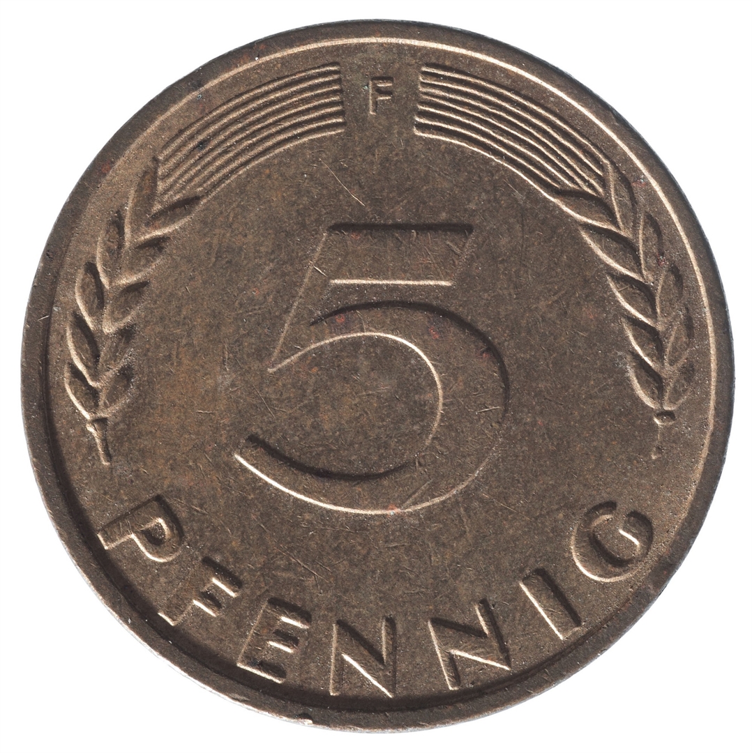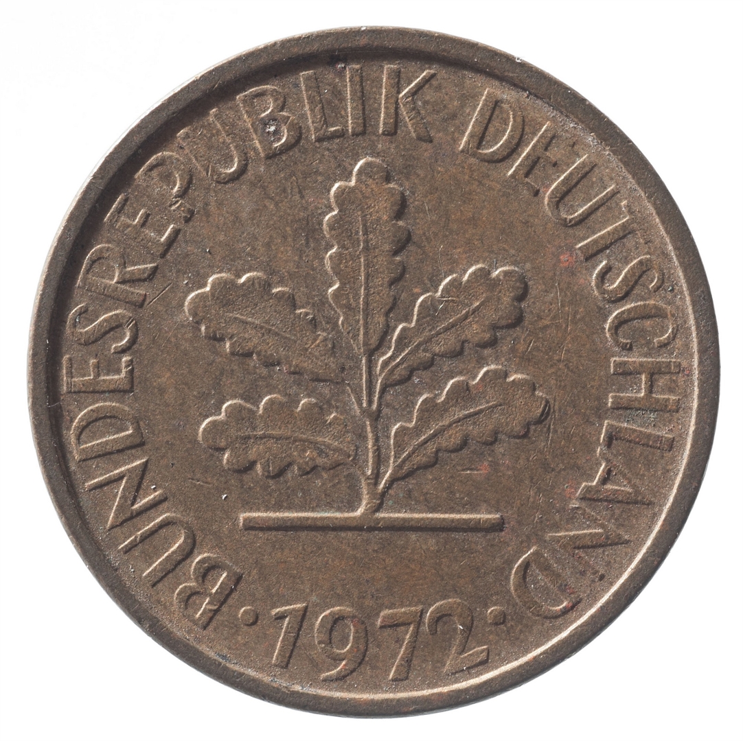 Avers: U sredini mladica hrasta s pet listova u vodoravnoj liniji. Uz rub ispisan tekst BUNDESREPUBLIK DEUTSCHLAND i godina 1972. Revers: U sredini broj 5. Na vrhu slovo F (oznaka kovnice), a uz donji rub riječ PFENNIG.
