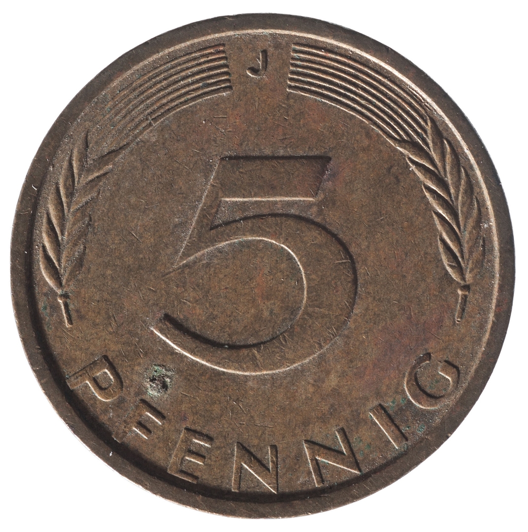 Avers: U sredini mladica hrasta s pet listova u vodoravnoj liniji. Uz rub ispisan tekst BUNDESREPUBLIK DEUTSCHLAND i godina 1972. Revers: U sredini broj 5. Na vrhu slovo J (oznaka kovnice), a uz donji rub riječ PFENNIG.
