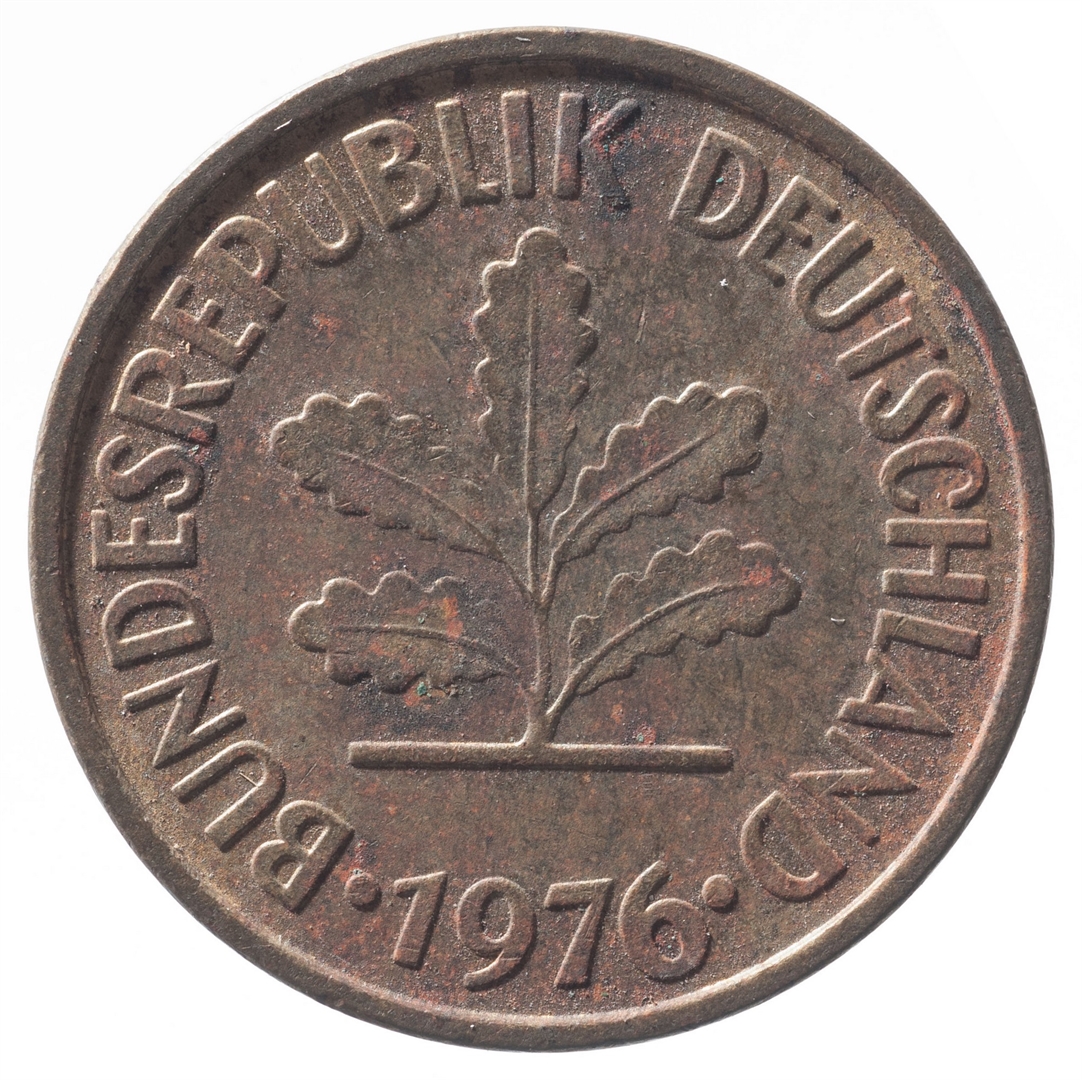 U sredini mladica hrasta s pet listova u vodoravnoj liniji. Uz rub ispisan tekst BUNDESREPUBLIK DEUTSCHLAND i godina 1976.