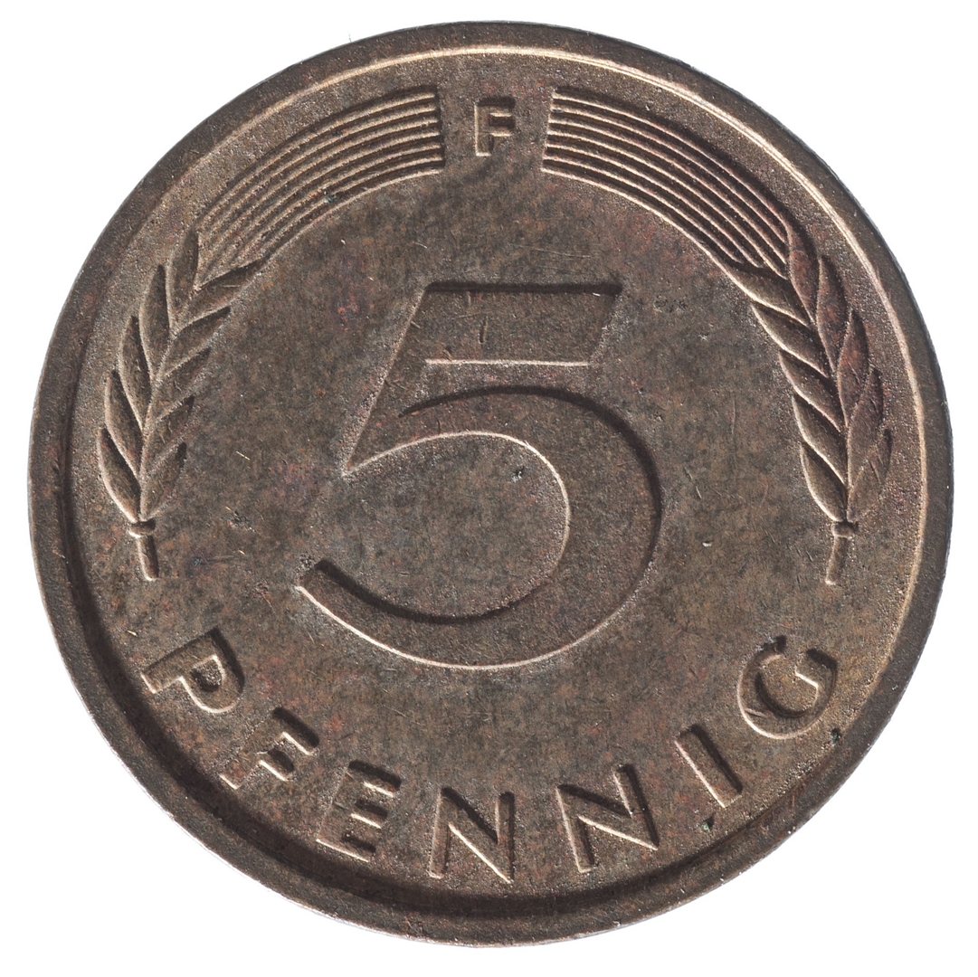 U sredini broj 5. Na vrhu slovo F (oznaka kovnice), a uz donji rub riječ PFENNIG.
