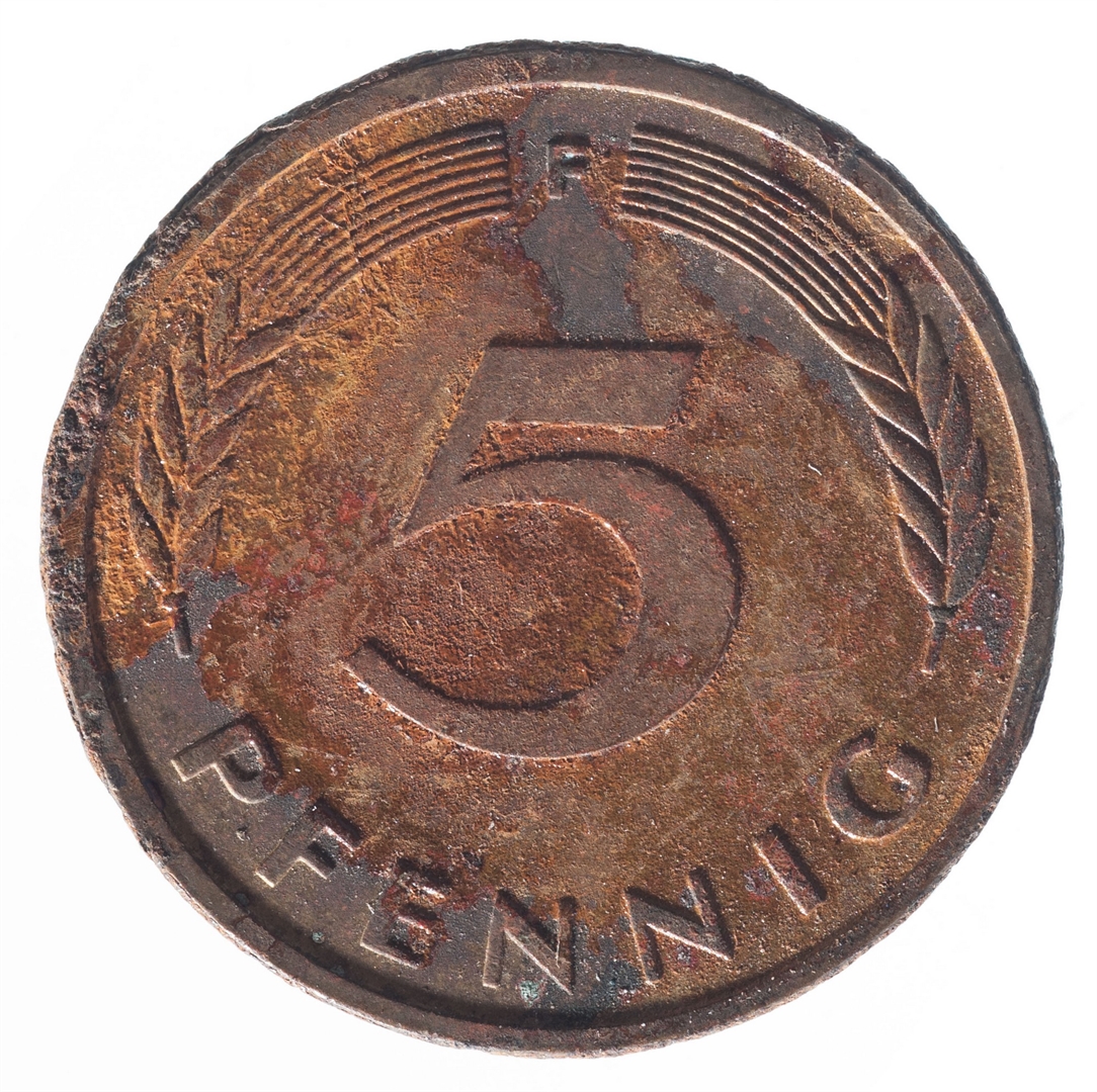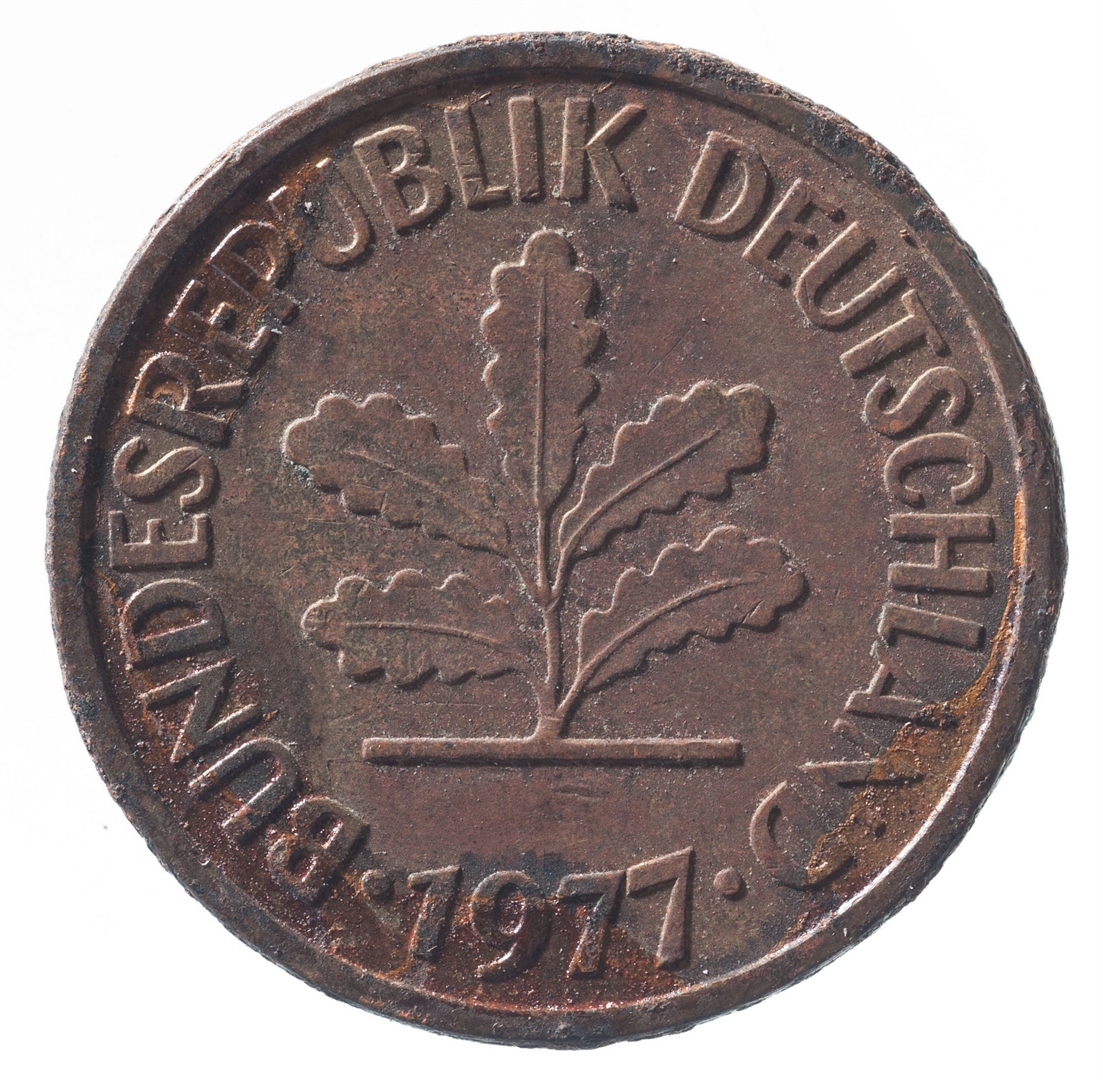 Avers: U sredini mladica hrasta s pet listova u vodoravnoj liniji. Uz rub ispisan tekst BUNDESREPUBLIK DEUTSCHLAND i godina 1977. Revers: U sredini broj 5. Na vrhu slovo F (oznaka kovnice), a uz donji rub riječ PFENNIG.
