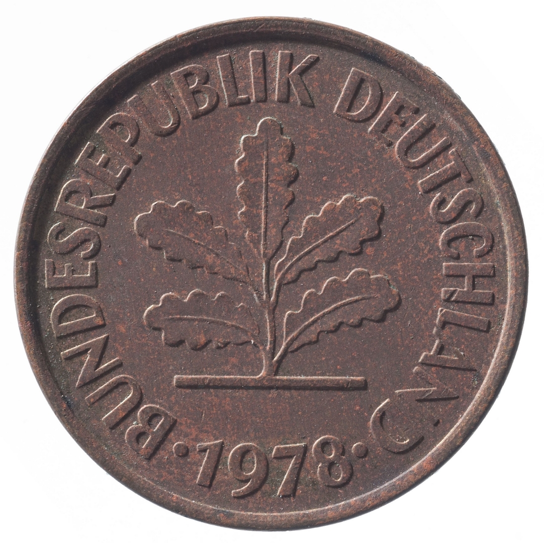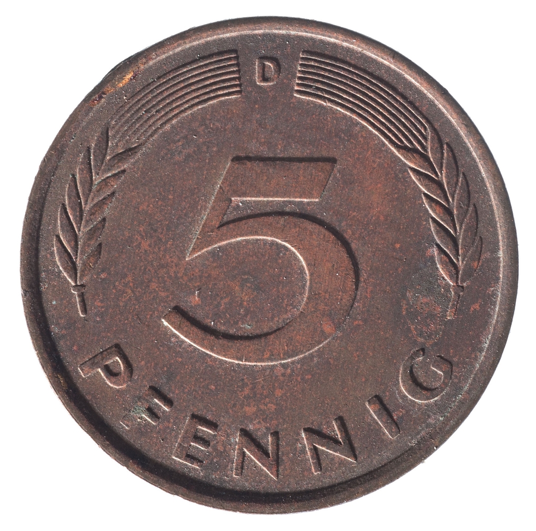 Avers: U sredini mladica hrasta s pet listova u vodoravnoj liniji. Uz rub ispisan tekst BUNDESREPUBLIK DEUTSCHLAND i godina 1978. Revers: U sredini broj 5. Na vrhu slovo D (oznaka kovnice), a uz donji rub riječ PFENNIG.