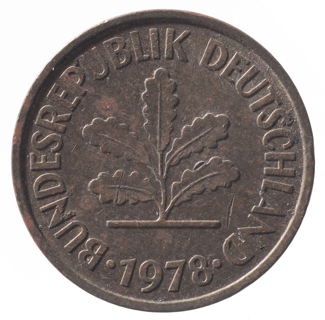 U sredini mladica hrasta s pet listova u vodoravnoj liniji. Uz rub ispisan tekst BUNDESREPUBLIK DEUTSCHLAND i godina 1978.