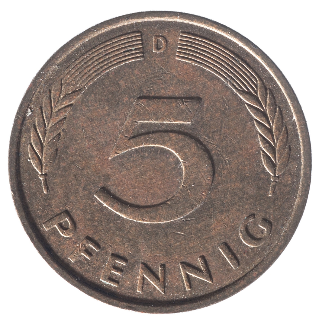 U sredini broj 5. Na vrhu slovo D (oznaka kovnice), a uz donji rub riječ PFENNIG.