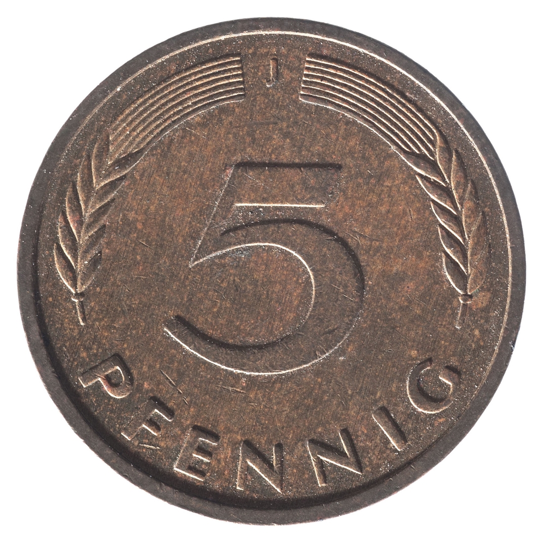 Avers: U sredini mladica hrasta s pet listova u vodoravnoj liniji. Uz rub ispisan tekst BUNDESREPUBLIK DEUTSCHLAND i godina 1980. Revers: U sredini broj 5. Na vrhu slovo J (oznaka kovnice), a uz donji rub riječ PFENNIG.