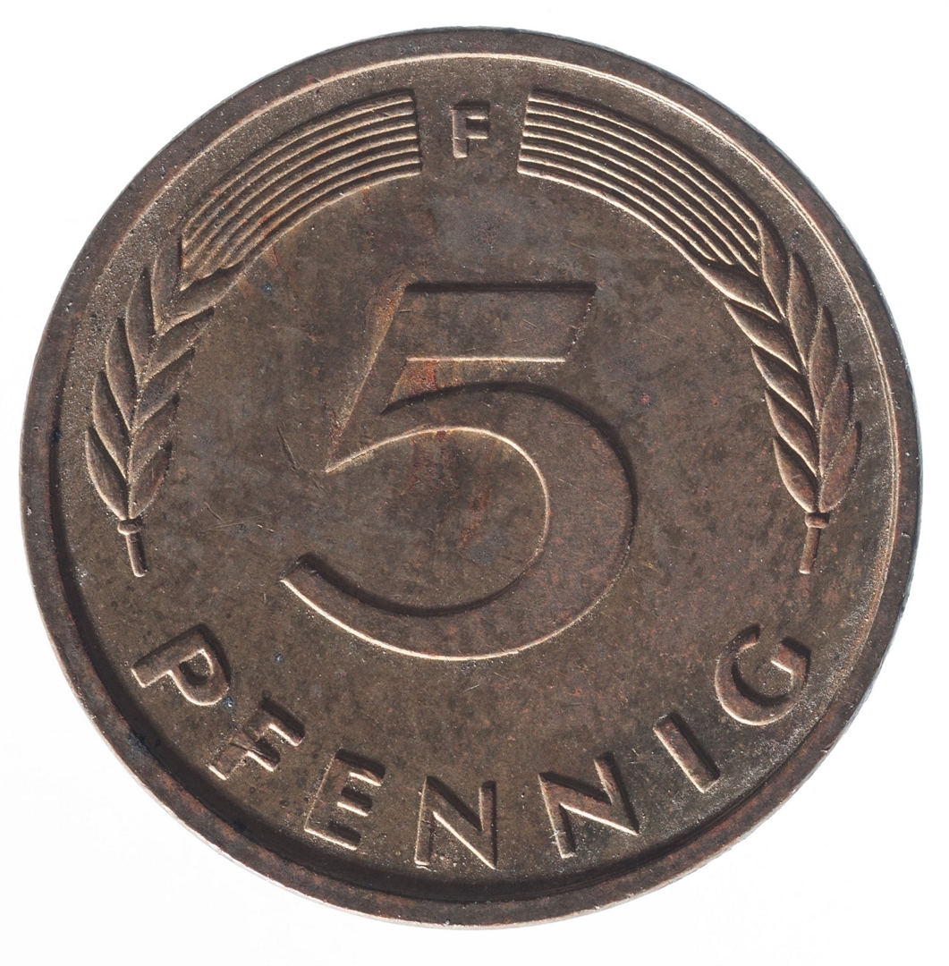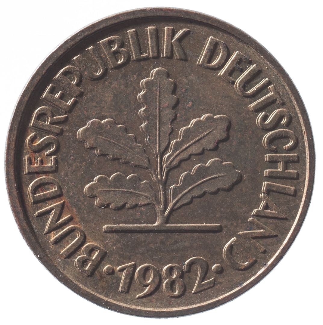 Avers: U sredini mladica hrasta s pet listova u vodoravnoj liniji. Uz rub ispisan tekst BUNDESREPUBLIK DEUTSCHLAND i godina 1982. Revers: U sredini broj 5. Na vrhu slovo F (oznaka kovnice), a uz donji rub riječ PFENNIG.