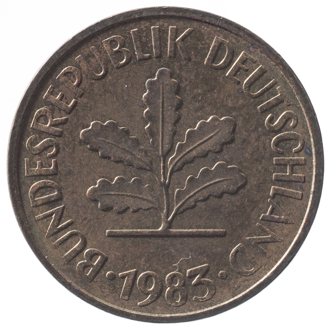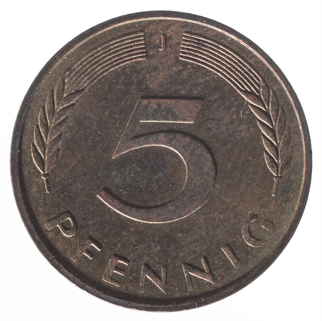 Avers: U sredini mladica hrasta s pet listova u vodoravnoj liniji. Uz rub ispisan tekst BUNDESREPUBLIK DEUTSCHLAND i godina 1983. Revers: U sredini broj 5. Na vrhu slovo J (oznaka kovnice), a uz donji rub riječ PFENNIG.