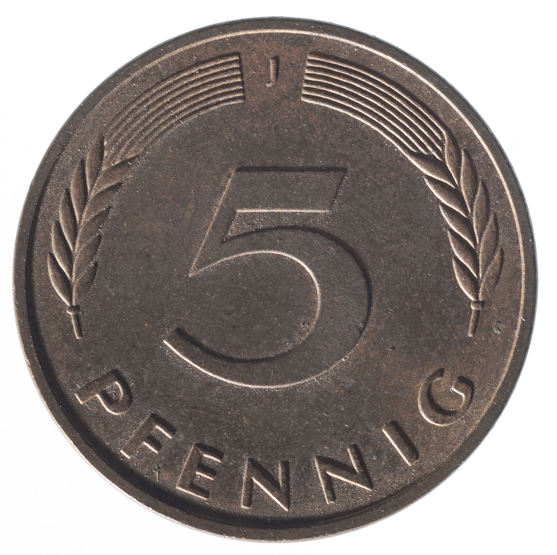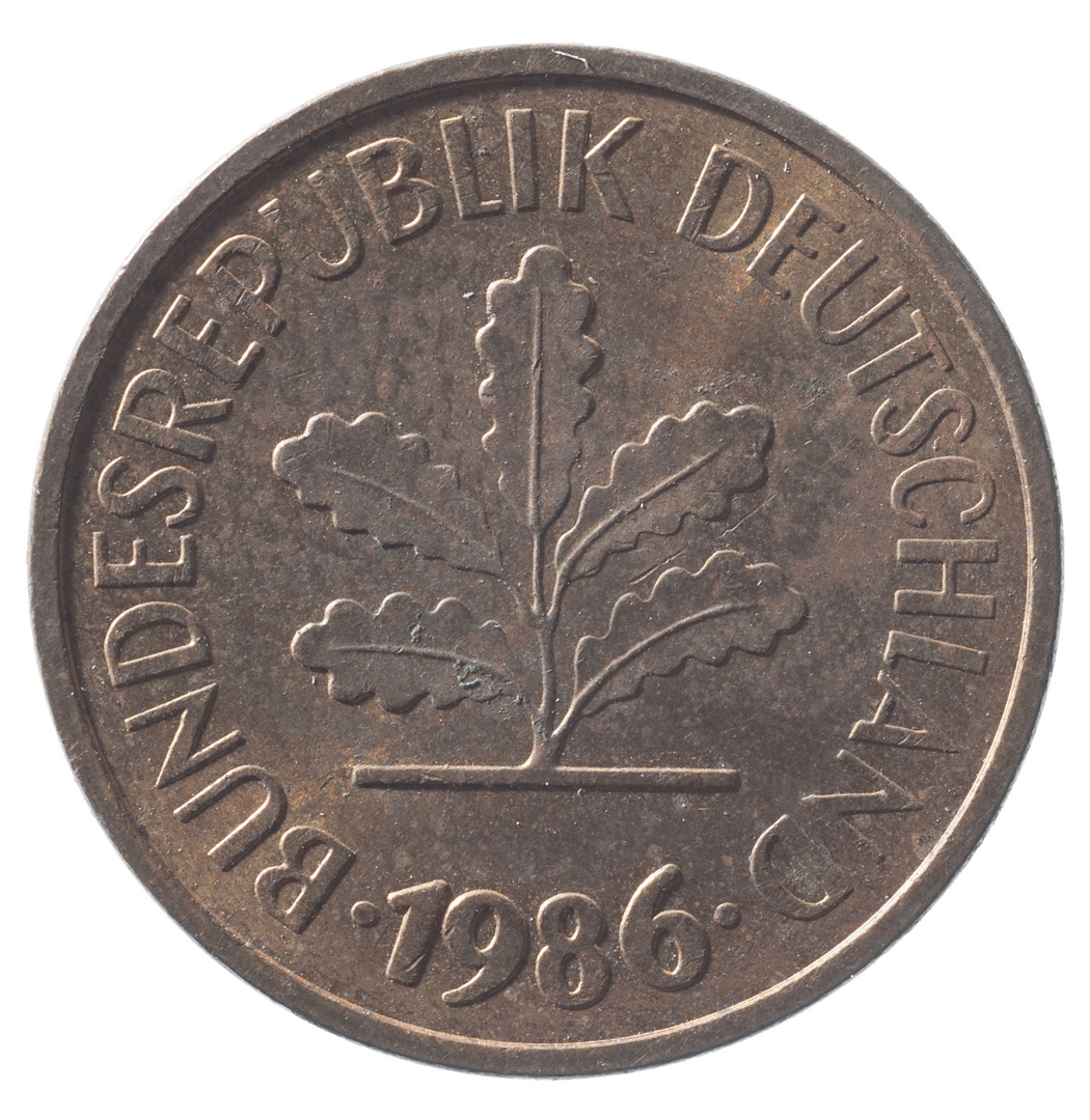 Avers: U sredini mladica hrasta s pet listova u vodoravnoj liniji. Uz rub ispisan tekst BUNDESREPUBLIK DEUTSCHLAND i godina 1986. Revers: U sredini broj 5. Na vrhu slovo J (oznaka kovnice), a uz donji rub riječ PFENNIG.