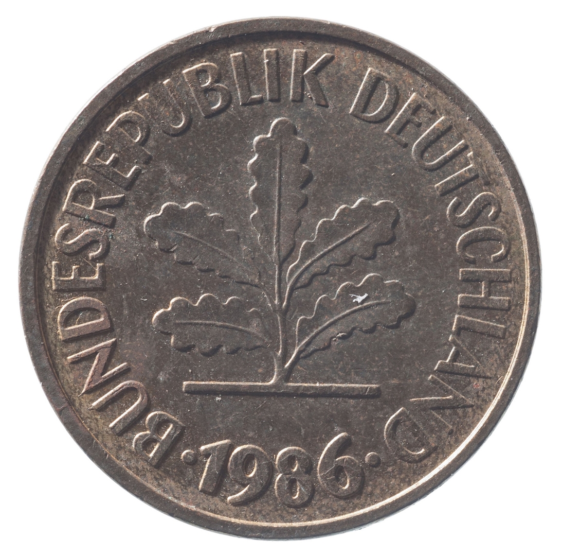 U sredini mladica hrasta s pet listova u vodoravnoj liniji. Uz rub ispisan tekst BUNDESREPUBLIK DEUTSCHLAND i godina 1986.