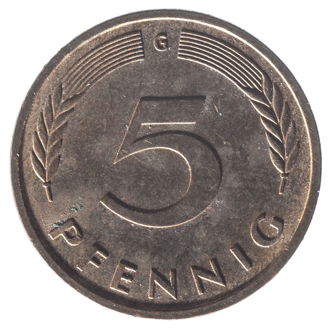 U sredini broj 5. Na vrhu slovo G (oznaka kovnice), a uz donji rub riječ PFENNIG.