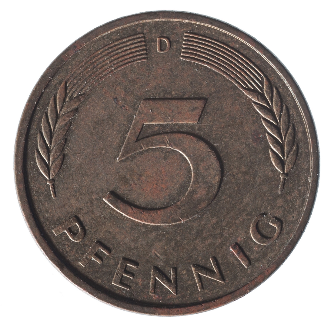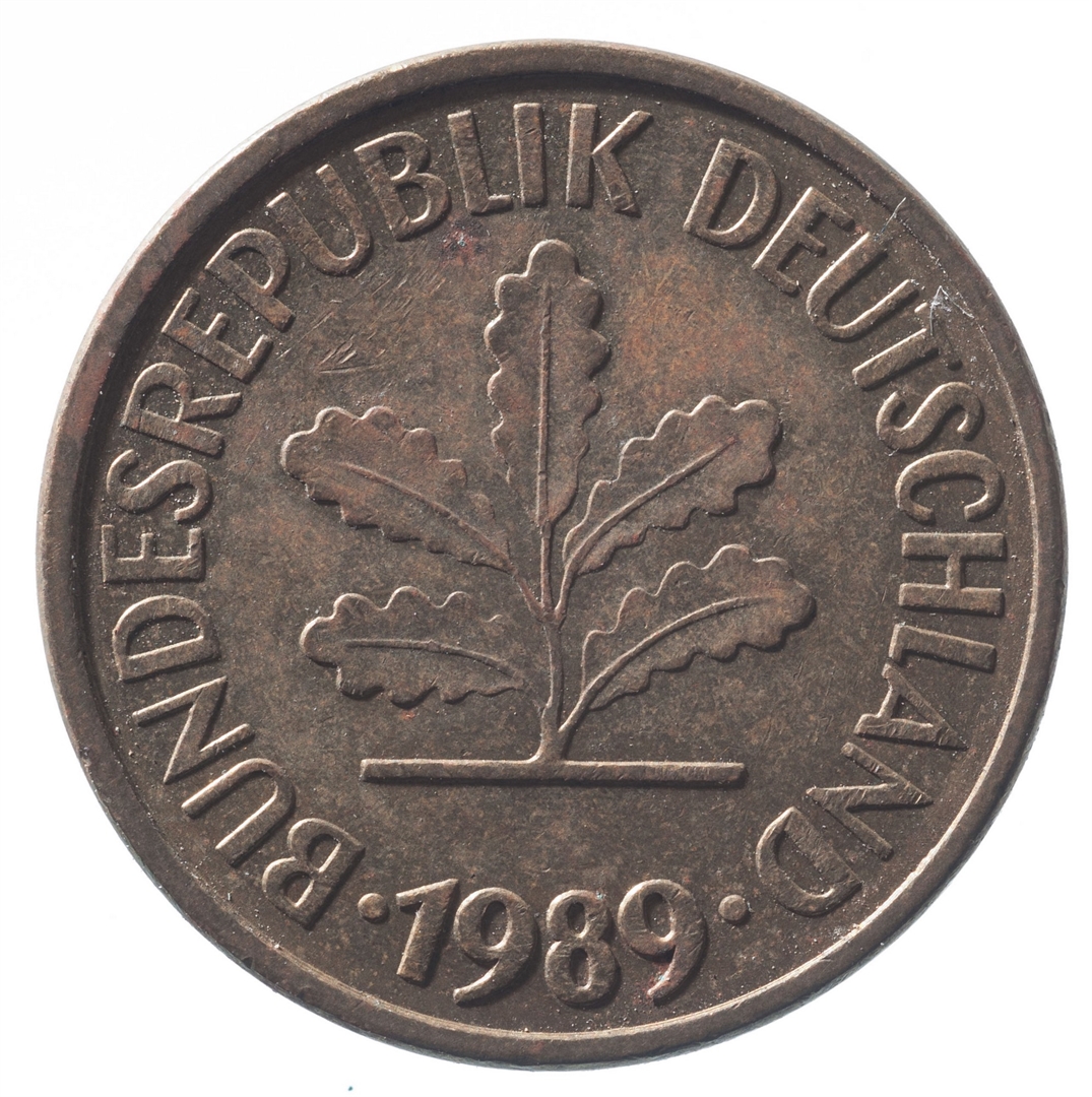 Avers: U sredini mladica hrasta s pet listova u vodoravnoj liniji. Uz rub ispisan tekst BUNDESREPUBLIK DEUTSCHLAND i godina 1989. Revers: U sredini broj 5. Na vrhu slovo D (oznaka kovnice), a uz donji rub riječ PFENNIG.