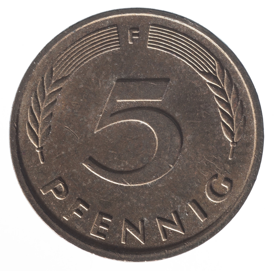 U sredini broj 5. Na vrhu slovo F (oznaka kovnice), a uz donji rub riječ PFENNIG.