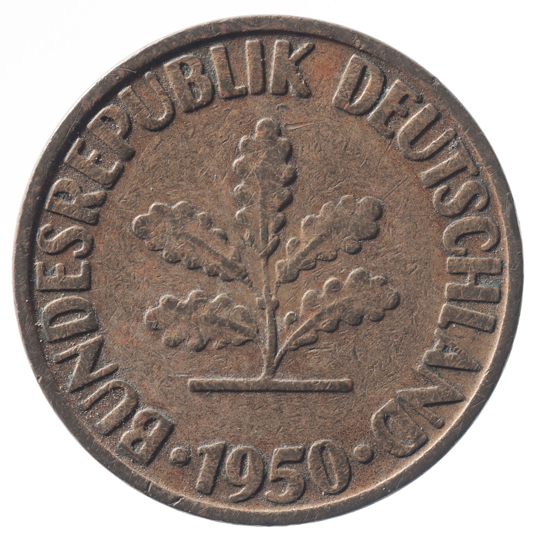 U sredini mladica hrasta s pet listova u vodoravnoj liniji. Uz rub ispisan tekst BUNDESREPUBLIK DEUTSCHLAND i godina 1950.