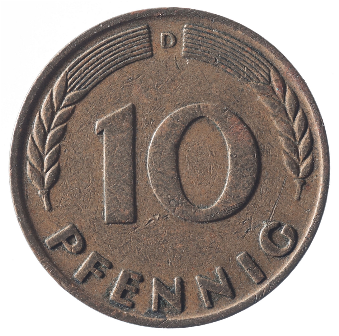 U sredini broj 10. Na vrhu slovo D (oznaka kovnice), a uz donji rub riječ PFENNIG.