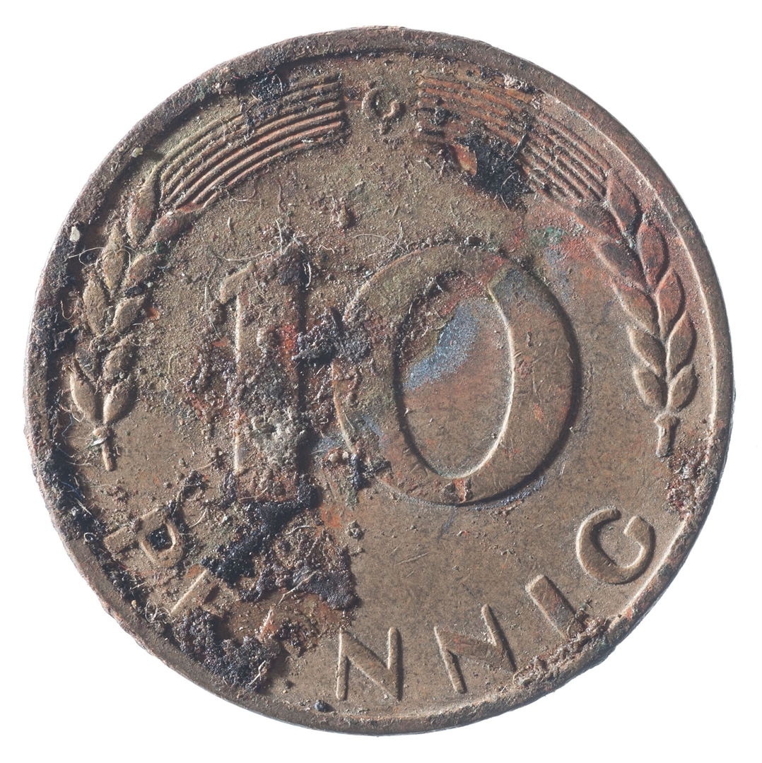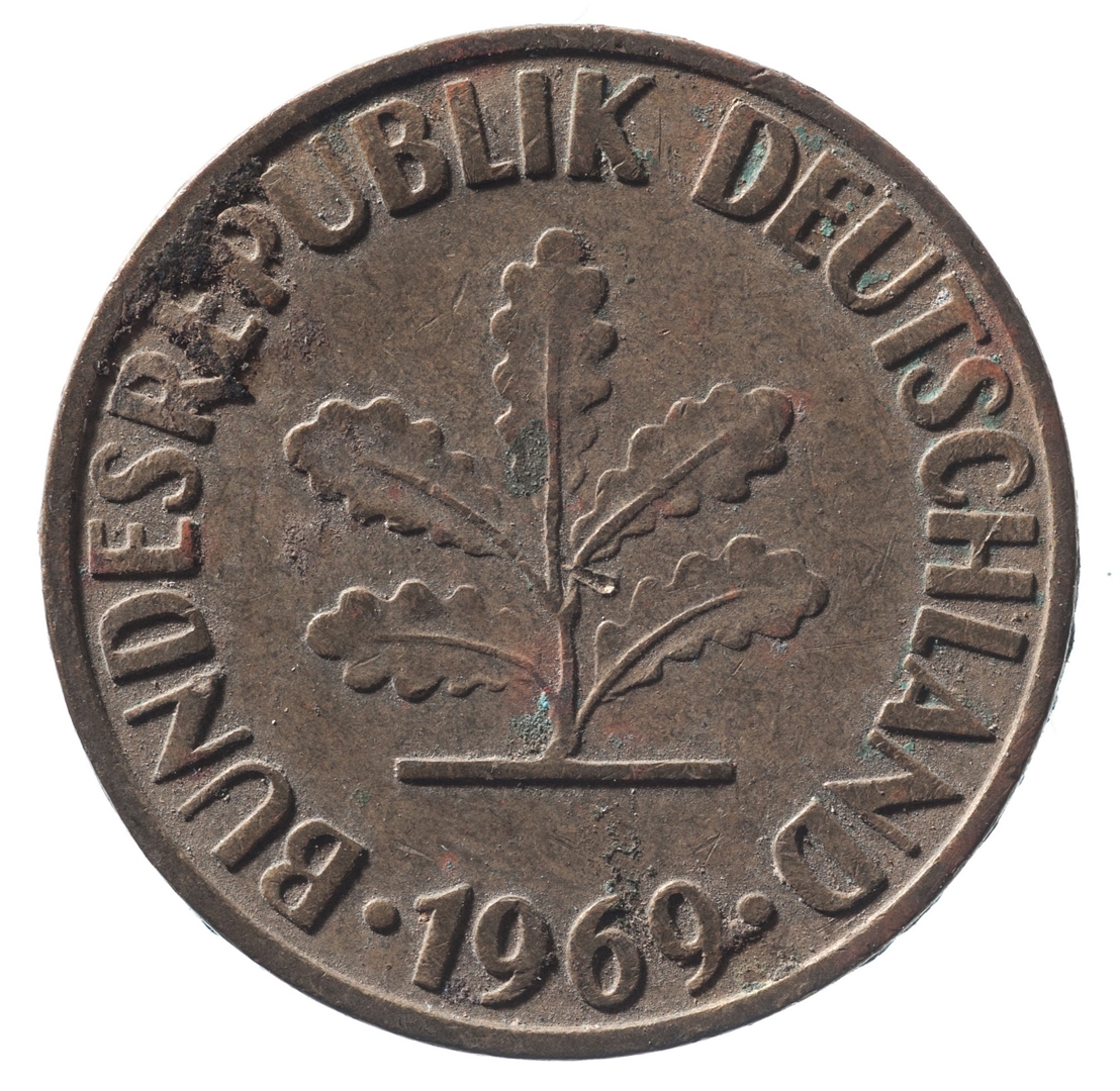 Avers: U sredini mladica hrasta s pet listova u vodoravnoj liniji. Uz rub ispisan tekst BUNDESREPUBLIK DEUTSCHLAND i godina 1969. Revers: U sredini broj 10. Na vrhu slovo G (oznaka kovnice), a uz donji rub riječ PFENNIG.