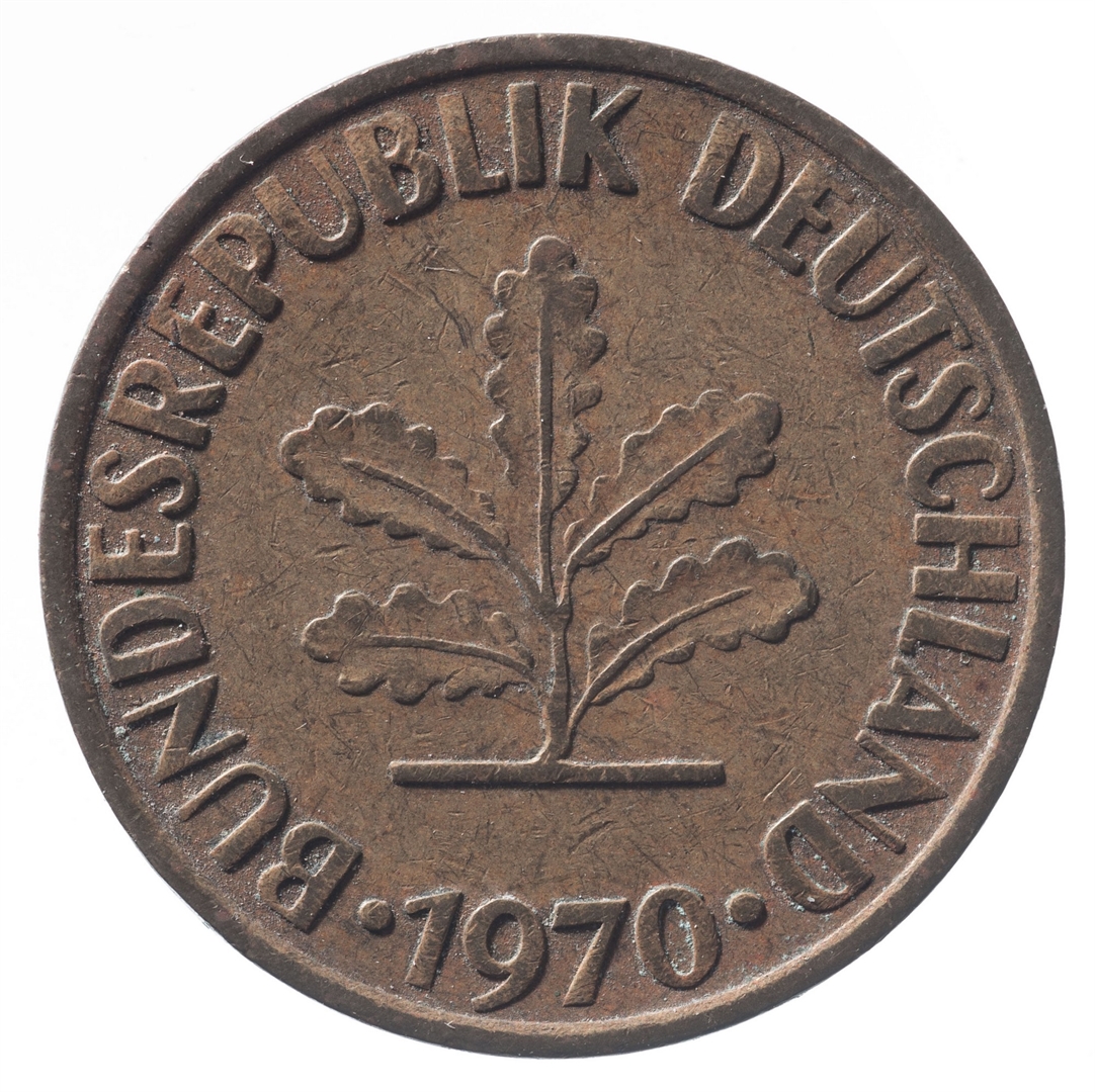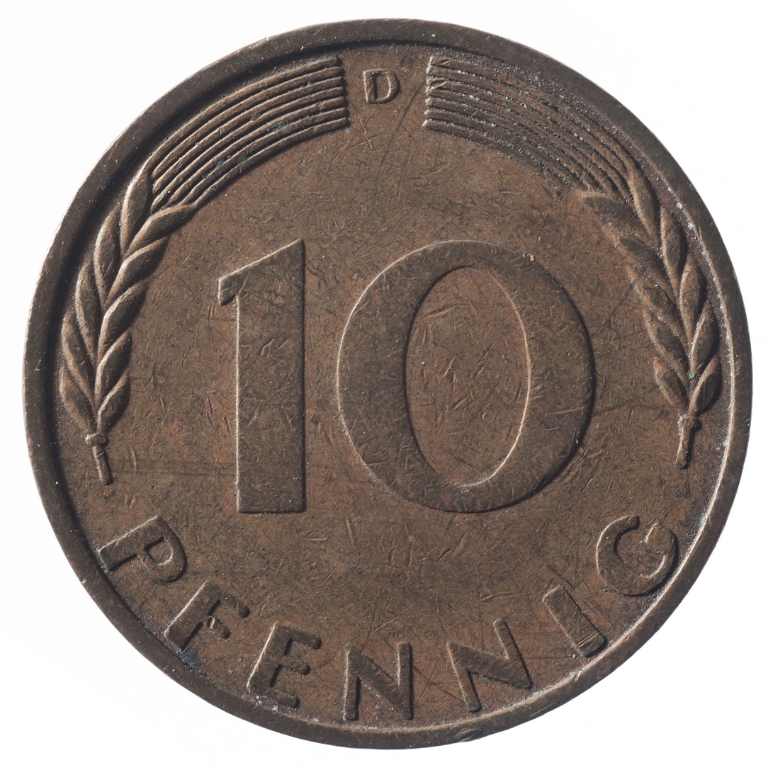 Avers: U sredini mladica hrasta s pet listova u vodoravnoj liniji. Uz rub ispisan tekst BUNDESREPUBLIK DEUTSCHLAND i godina 1970. Revers: U sredini broj 10. Na vrhu slovo D (oznaka kovnice), a uz donji rub riječ PFENNIG.