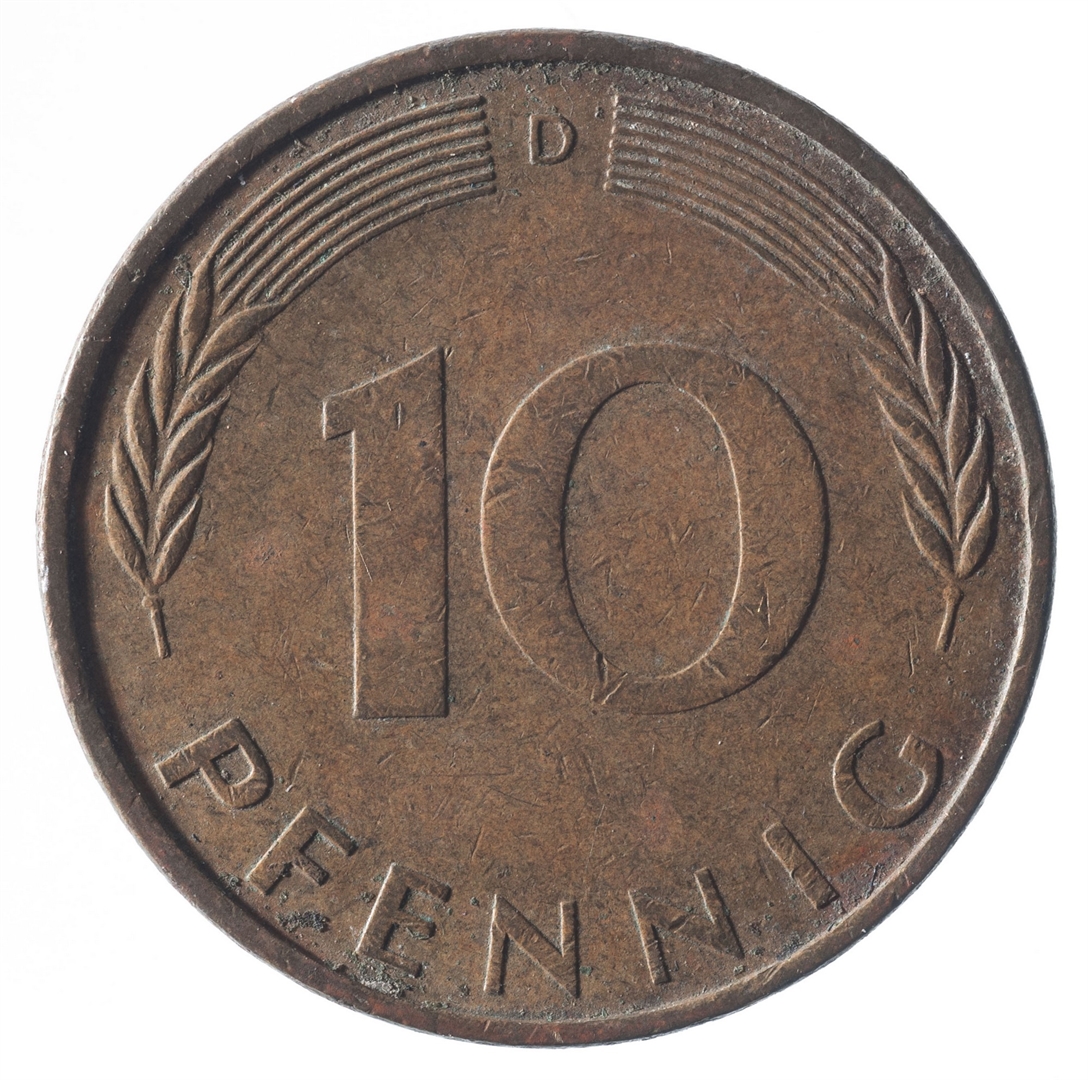 Avers: U sredini mladica hrasta s pet listova u vodoravnoj liniji. Uz rub ispisan tekst BUNDESREPUBLIK DEUTSCHLAND i godina 1971. Revers: U sredini broj 10. Na vrhu slovo D (oznaka kovnice), a uz donji rub riječ PFENNIG.
