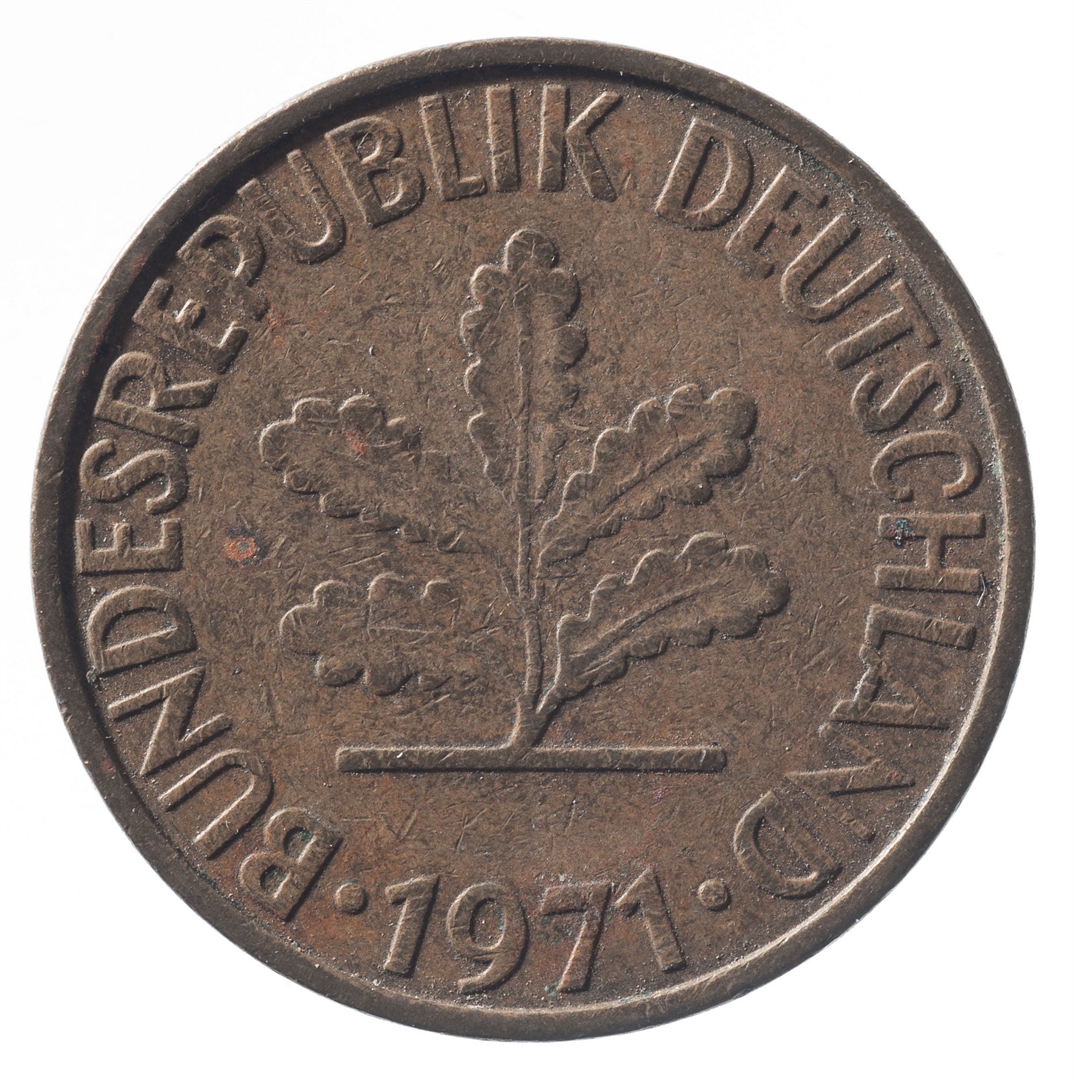 U sredini mladica hrasta s pet listova u vodoravnoj liniji. Uz rub ispisan tekst BUNDESREPUBLIK DEUTSCHLAND i godina 1971.