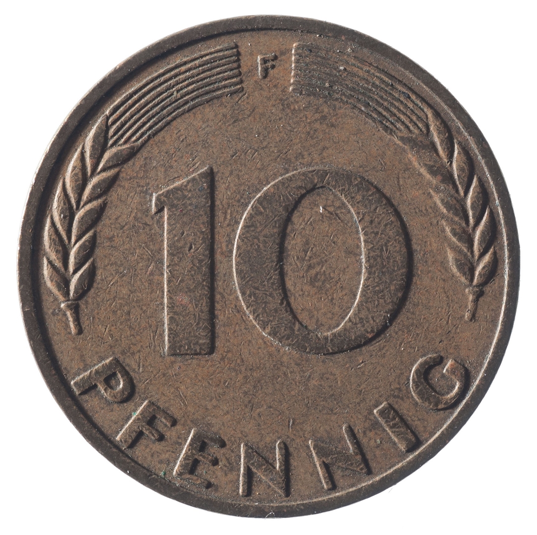 U sredini broj 10. Na vrhu slovo F (oznaka kovnice), a uz donji rub riječ PFENNIG.