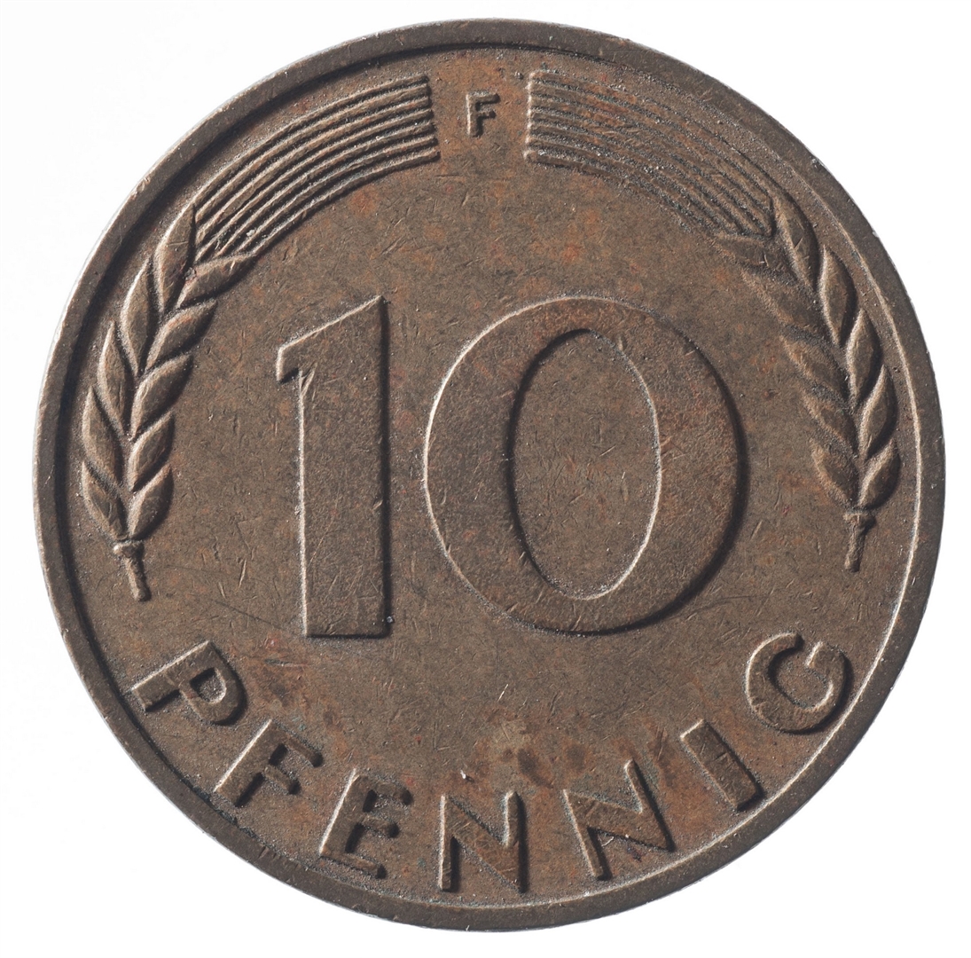 U sredini broj 10. Na vrhu slovo F (oznaka kovnice), a uz donji rub riječ PFENNIG.