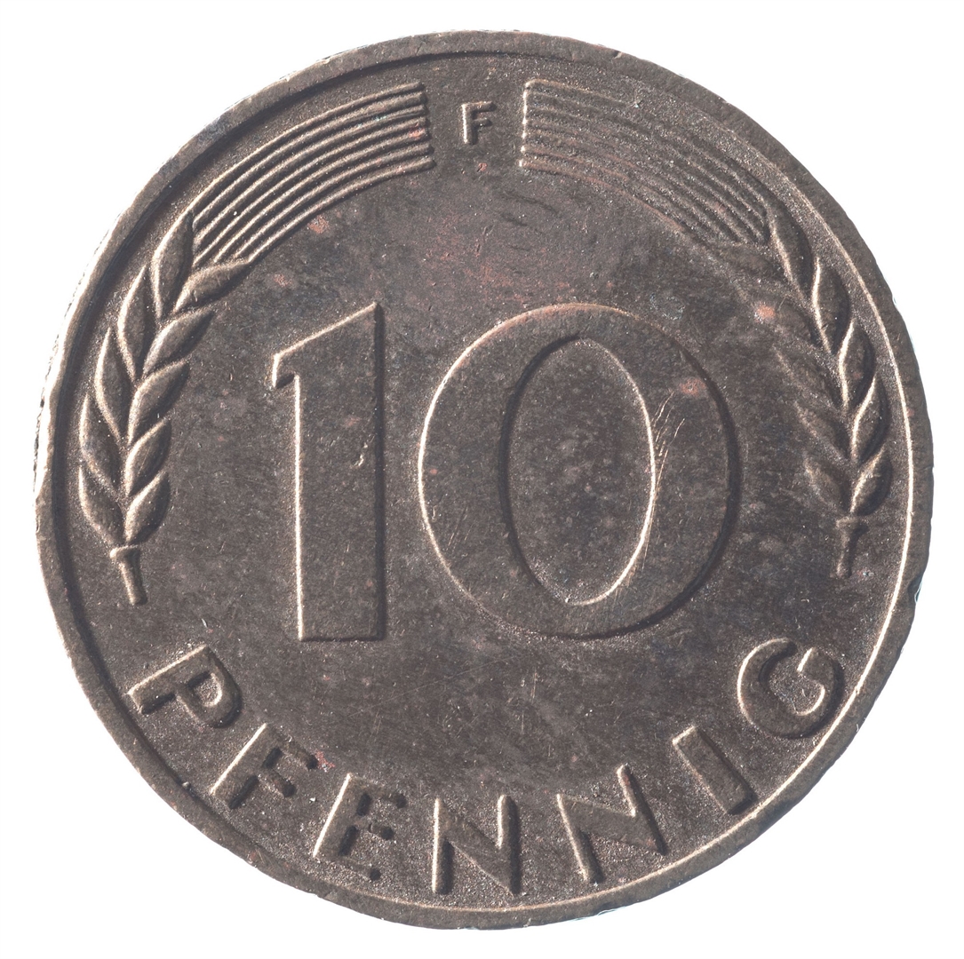Avers: U sredini mladica hrasta s pet listova u vodoravnoj liniji. Uz rub ispisan tekst BUNDESREPUBLIK DEUTSCHLAND i godina 1972. Revers: U sredini broj 10. Na vrhu slovo F (oznaka kovnice), a uz donji rub riječ PFENNIG.