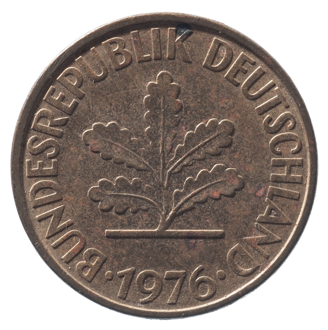 U sredini mladica hrasta s pet listova u vodoravnoj liniji. Uz rub ispisan tekst BUNDESREPUBLIK DEUTSCHLAND i godina 1976.