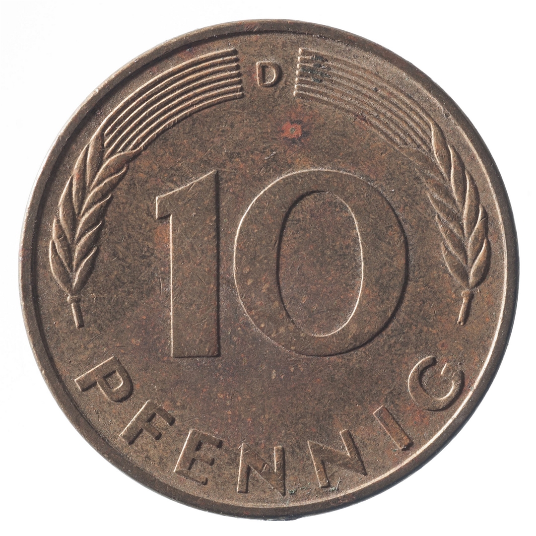 U sredini broj 10. Na vrhu slovo D (oznaka kovnice), a uz donji rub riječ PFENNIG.