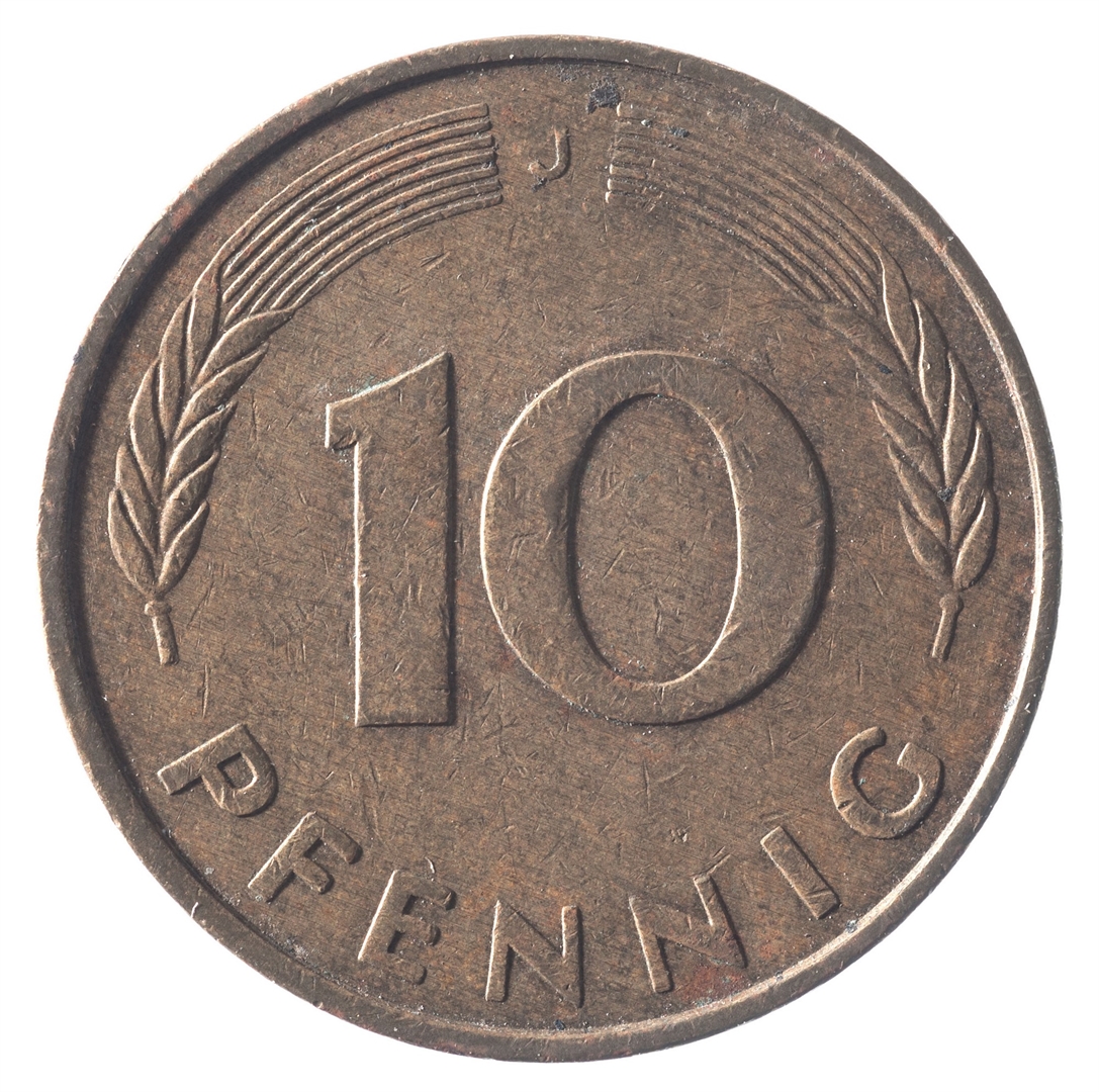 Avers: U sredini mladica hrasta s pet listova u vodoravnoj liniji. Uz rub ispisan tekst BUNDESREPUBLIK DEUTSCHLAND i godina 1976. Revers: U sredini broj 10. Na vrhu slovo J (oznaka kovnice), a uz donji rub riječ PFENNIG.