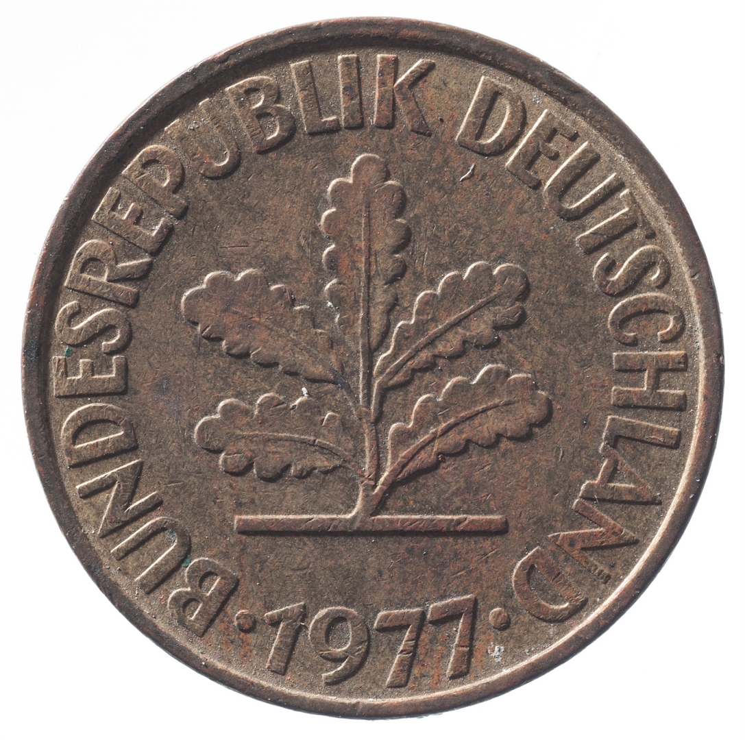 Avers: U sredini mladica hrasta s pet listova u vodoravnoj liniji. Uz rub ispisan tekst BUNDESREPUBLIK DEUTSCHLAND i godina 1977. Revers: U sredini broj 10. Na vrhu slovo F (oznaka kovnice), a uz donji rub riječ PFENNIG.