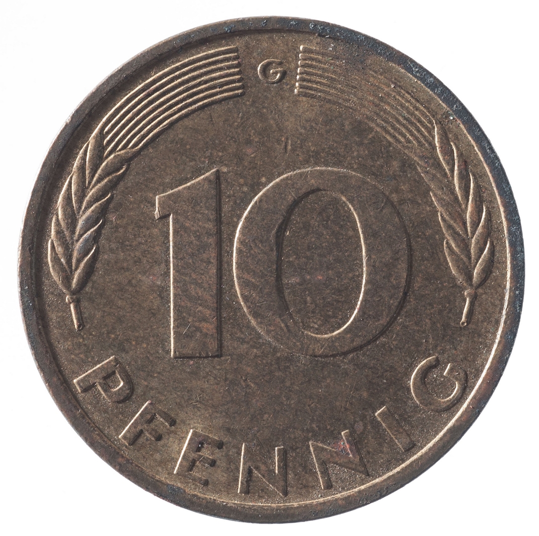 Avers: U sredini mladica hrasta s pet listova u vodoravnoj liniji. Uz rub ispisan tekst BUNDESREPUBLIK DEUTSCHLAND i godina 1978. Revers: U sredini broj 10. Na vrhu slovo G (oznaka kovnice), a uz donji rub riječ PFENNIG.