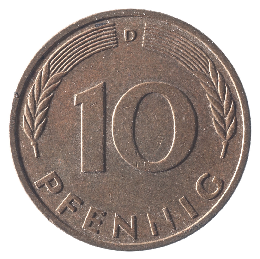 Avers: U sredini mladica hrasta s pet listova u vodoravnoj liniji. Uz rub ispisan tekst BUNDESREPUBLIK DEUTSCHLAND i godina 1981. Revers: U sredini broj 10. Na vrhu slovo D (oznaka kovnice), a uz donji rub riječ PFENNIG.