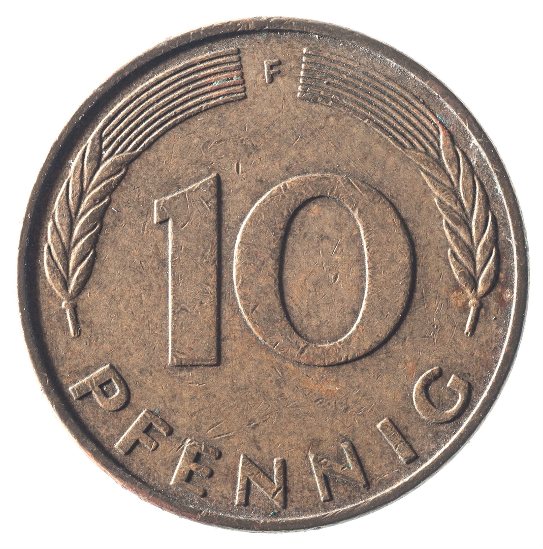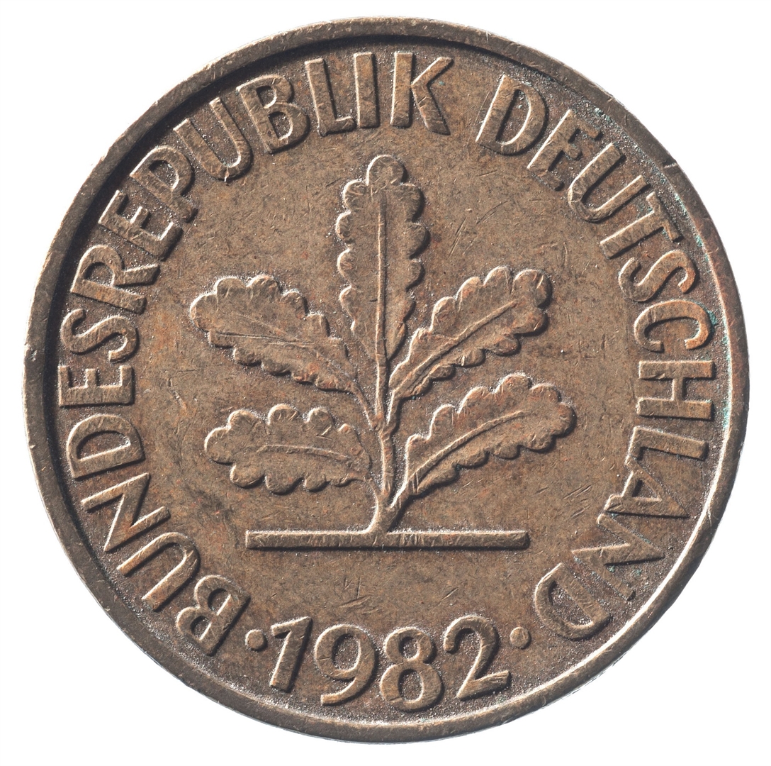 Avers: U sredini mladica hrasta s pet listova u vodoravnoj liniji. Uz rub ispisan tekst BUNDESREPUBLIK DEUTSCHLAND i godina 1982. Revers: U sredini broj 10. Na vrhu slovo F (oznaka kovnice), a uz donji rub riječ PFENNIG.