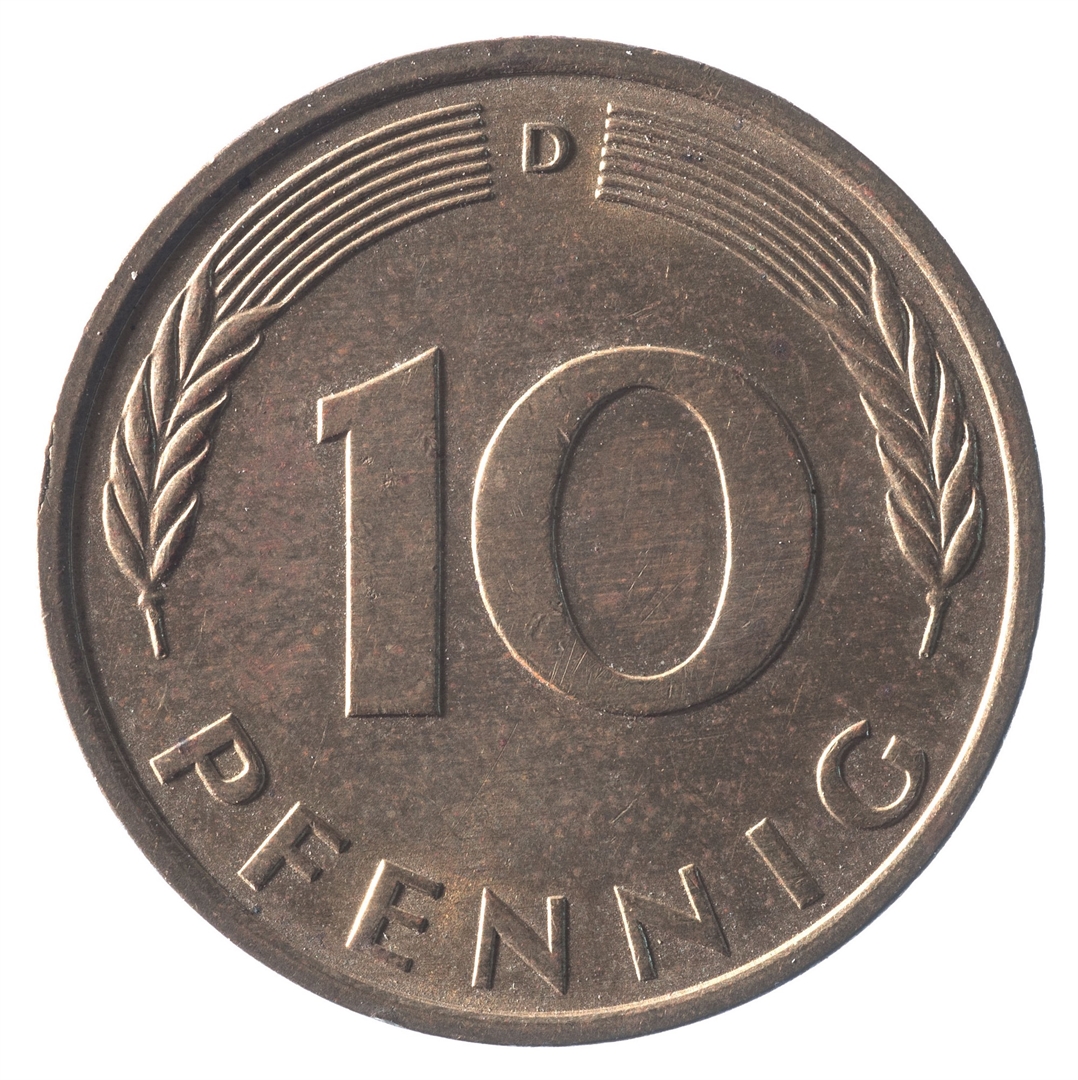 U sredini broj 10. Na vrhu slovo D (oznaka kovnice), a uz donji rub riječ PFENNIG.