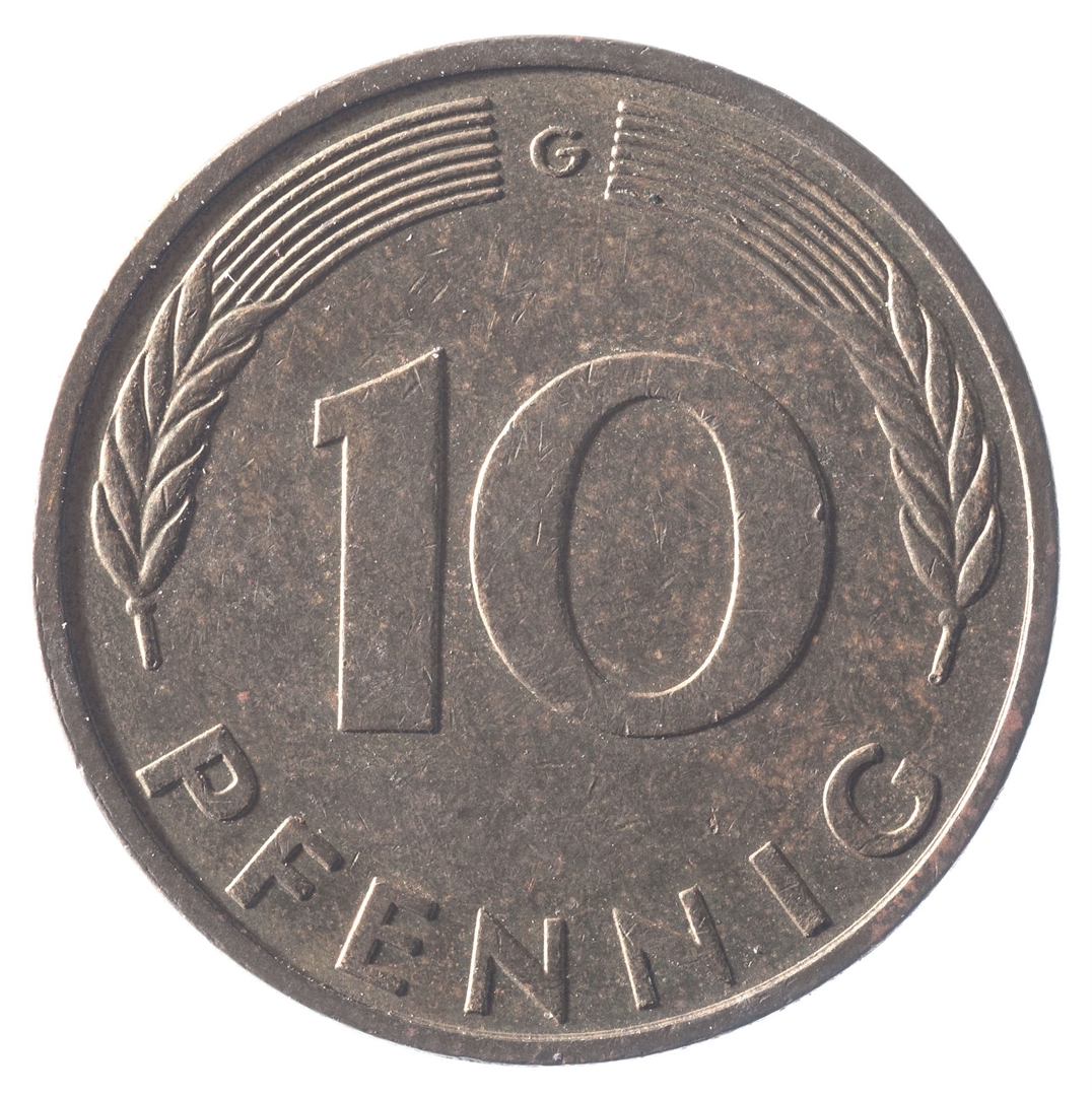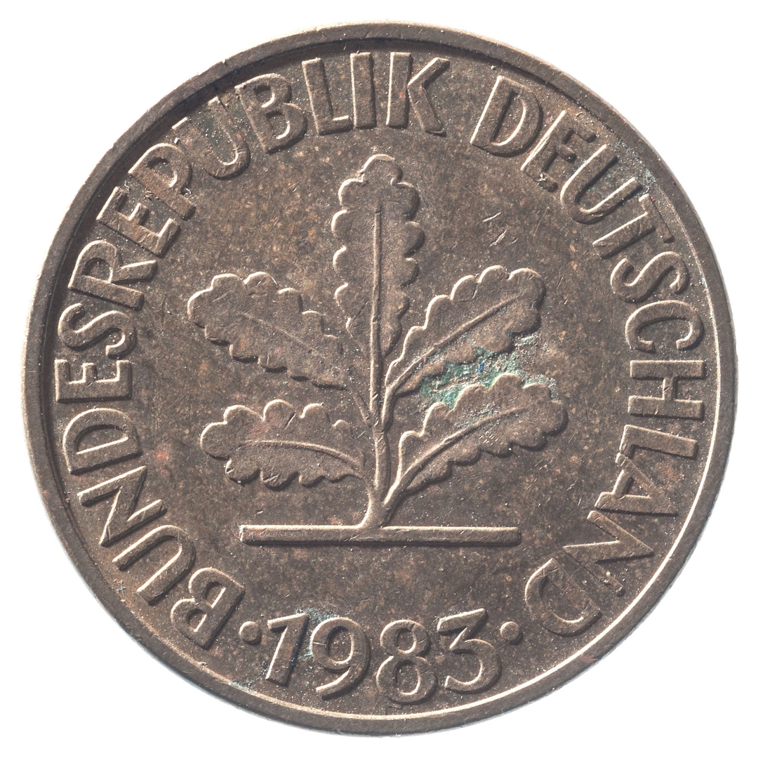 Avers: U sredini mladica hrasta s pet listova u vodoravnoj liniji. Uz rub ispisan tekst BUNDESREPUBLIK DEUTSCHLAND i godina 1983. Revers: U sredini broj 10. Na vrhu slovo G (oznaka kovnice), a uz donji rub riječ PFENNIG.