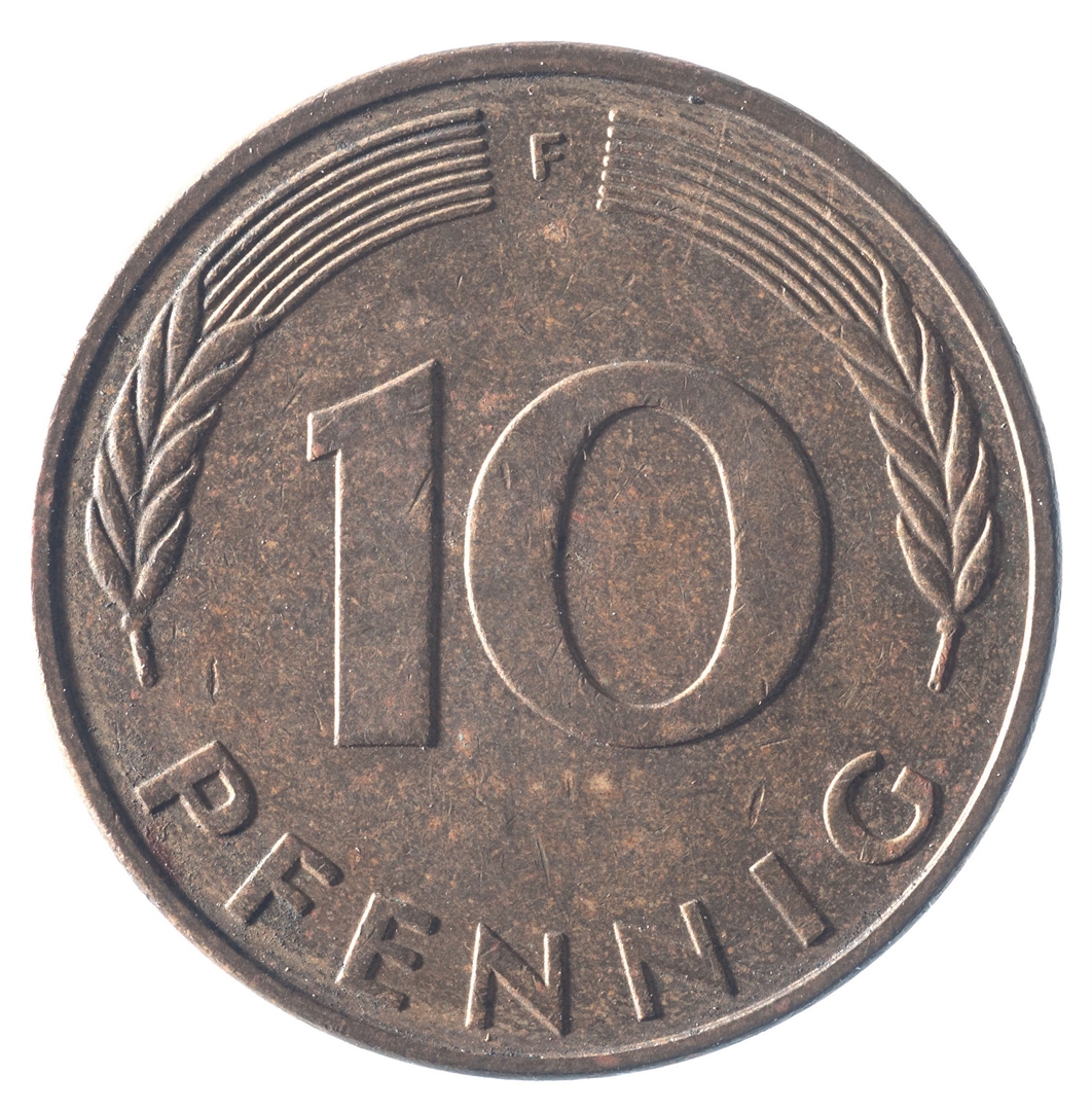 Avers: U sredini mladica hrasta s pet listova u vodoravnoj liniji. Uz rub ispisan tekst BUNDESREPUBLIK DEUTSCHLAND i godina 1985. Revers: U sredini broj 10. Na vrhu slovo F (oznaka kovnice), a uz donji rub riječ PFENNIG.