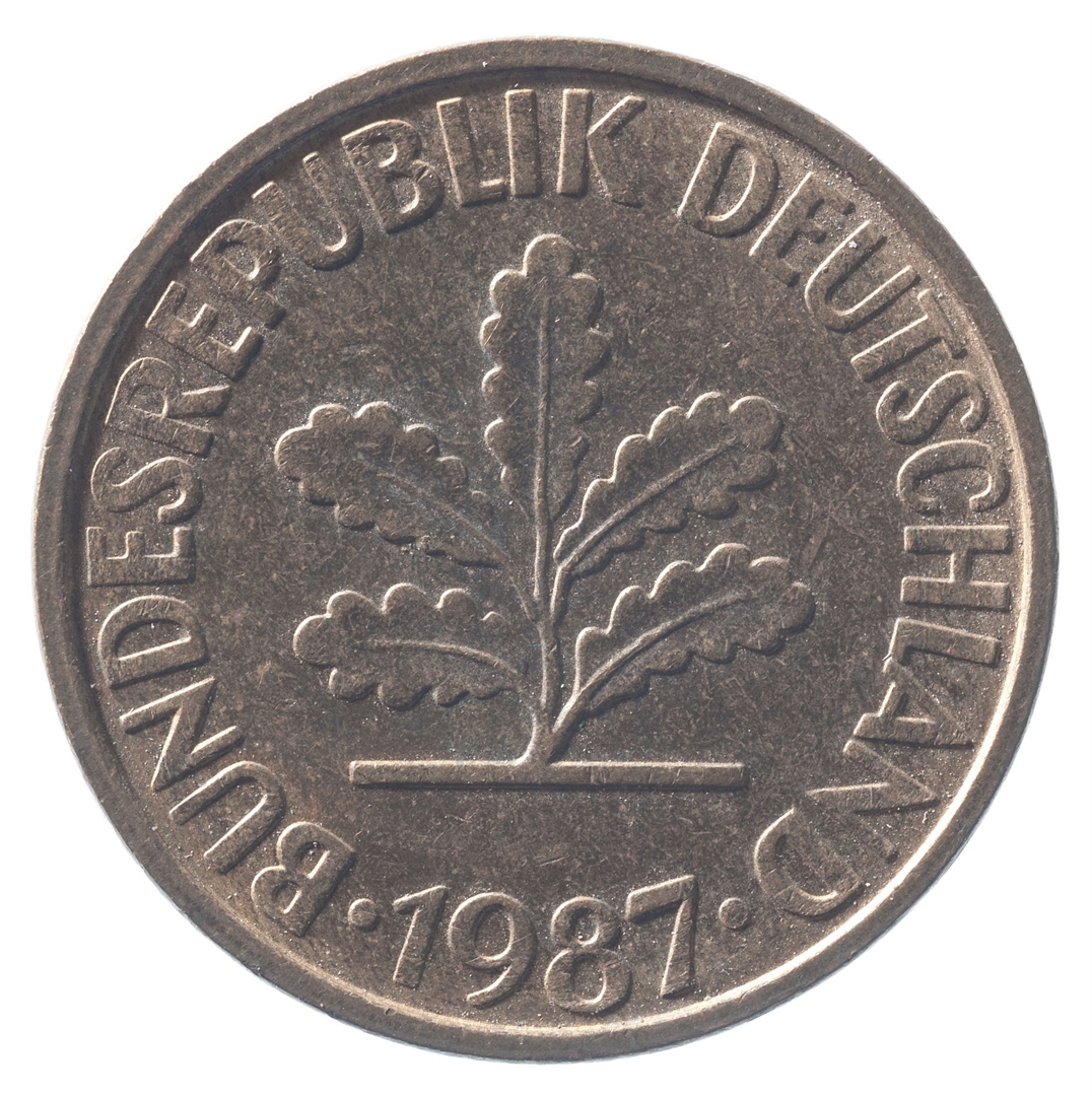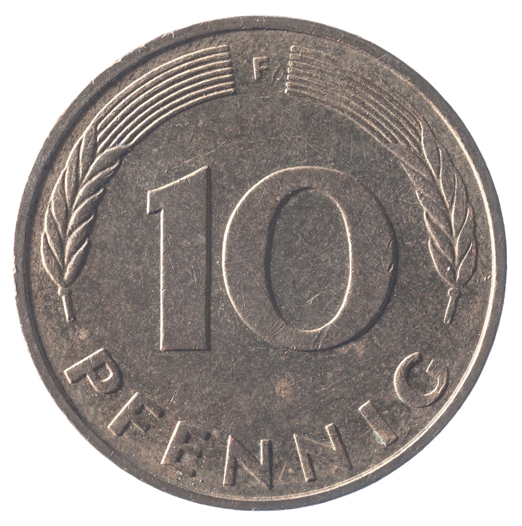Avers: U sredini mladica hrasta s pet listova u vodoravnoj liniji. Uz rub ispisan tekst BUNDESREPUBLIK DEUTSCHLAND i godina 1987. Revers: U sredini broj 10. Na vrhu slovo F (oznaka kovnice), a uz donji rub riječ PFENNIG.