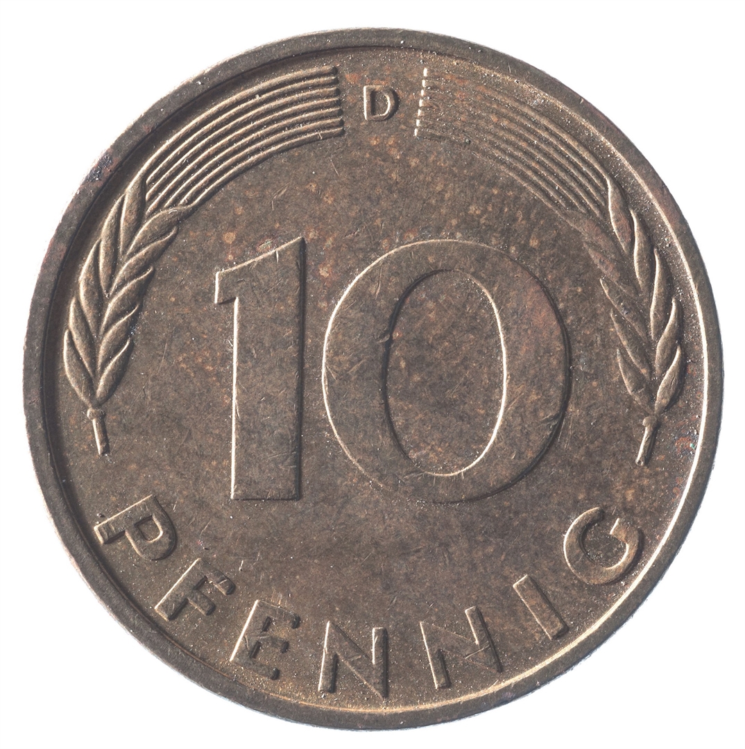 Avers: U sredini mladica hrasta s pet listova u vodoravnoj liniji. Uz rub ispisan tekst BUNDESREPUBLIK DEUTSCHLAND i godina 1988. Revers: U sredini broj 10. Na vrhu slovo D (oznaka kovnice), a uz donji rub riječ PFENNIG.