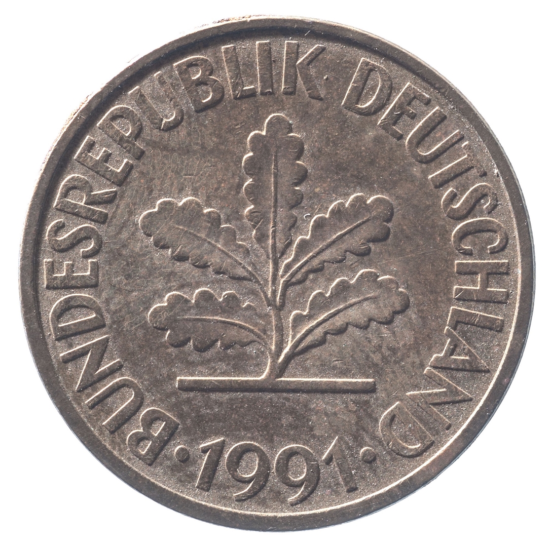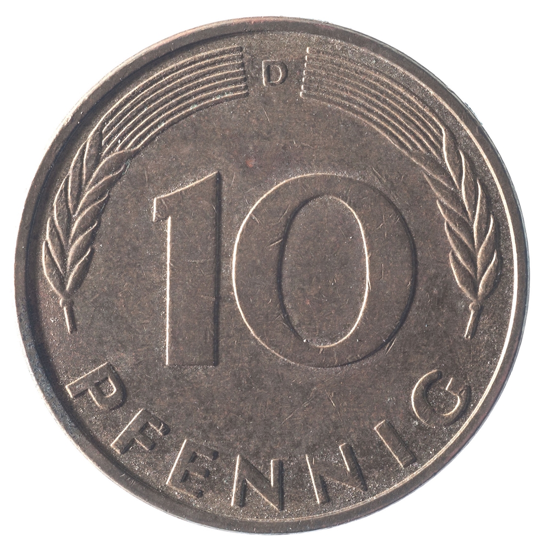 Avers: U sredini mladica hrasta s pet listova u vodoravnoj liniji. Uz rub ispisan tekst BUNDESREPUBLIK DEUTSCHLAND i godina 1991. Revers: U sredini broj 10. Na vrhu slovo D (oznaka kovnice), a uz donji rub riječ PFENNIG.
