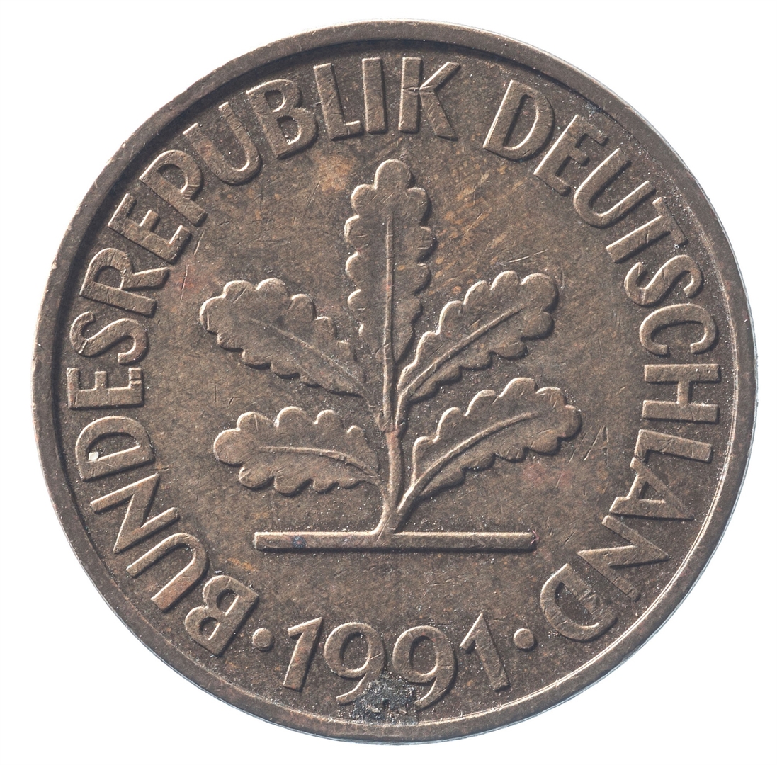 U sredini mladica hrasta s pet listova u vodoravnoj liniji. Uz rub ispisan tekst BUNDESREPUBLIK DEUTSCHLAND i godina 1991.
