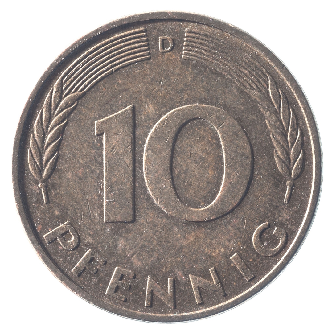 U sredini broj 10. Na vrhu slovo D (oznaka kovnice), a uz donji rub riječ PFENNIG.