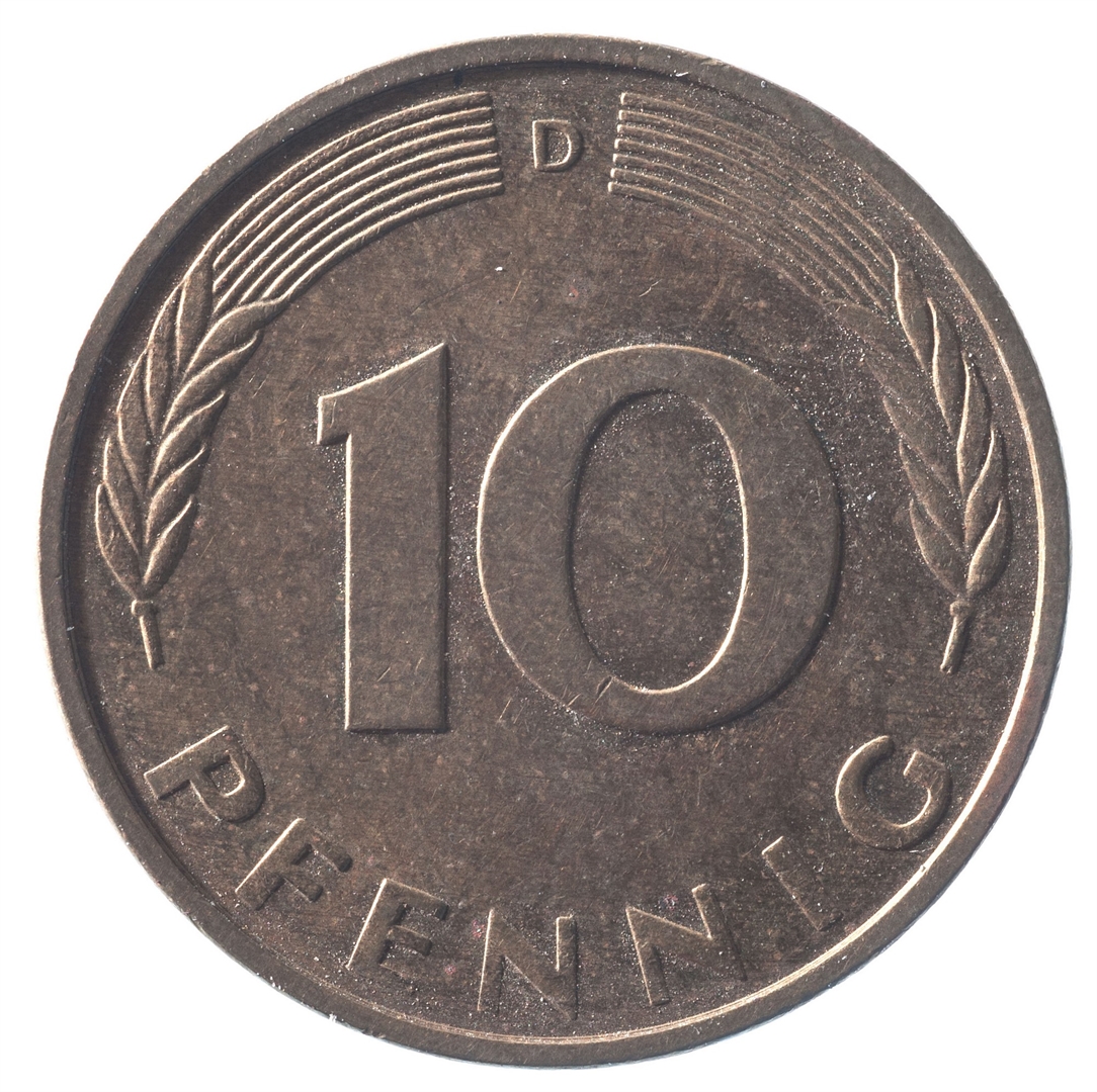Avers: U sredini mladica hrasta s pet listova u vodoravnoj liniji. Uz rub ispisan tekst BUNDESREPUBLIK DEUTSCHLAND i godina 1992. Revers: U sredini broj 10. Na vrhu slovo D (oznaka kovnice), a uz donji rub riječ PFENNIG.