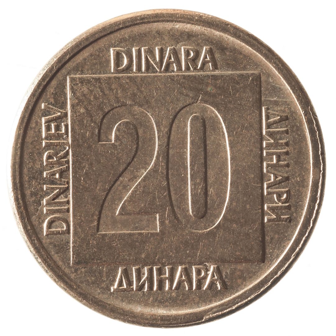 U sredini četverokuta broj 20 (nominala), oko njega tekst DINAR na četiri jezika.