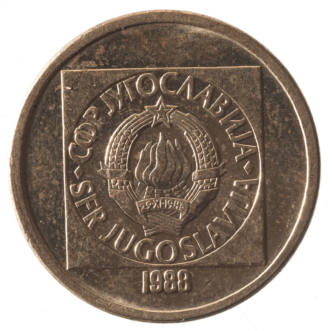 U sredini unutar četverokuta državni grb, a oko njega uz rub polukružno napisan tekst SFR JUGOSLAVIJA na latinici i ćirilici. Ispod godina 1988.
