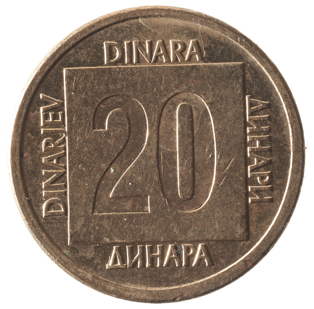 U sredini četverokuta broj 20 (nominala), oko njega tekst DINAR na četiri jezika.