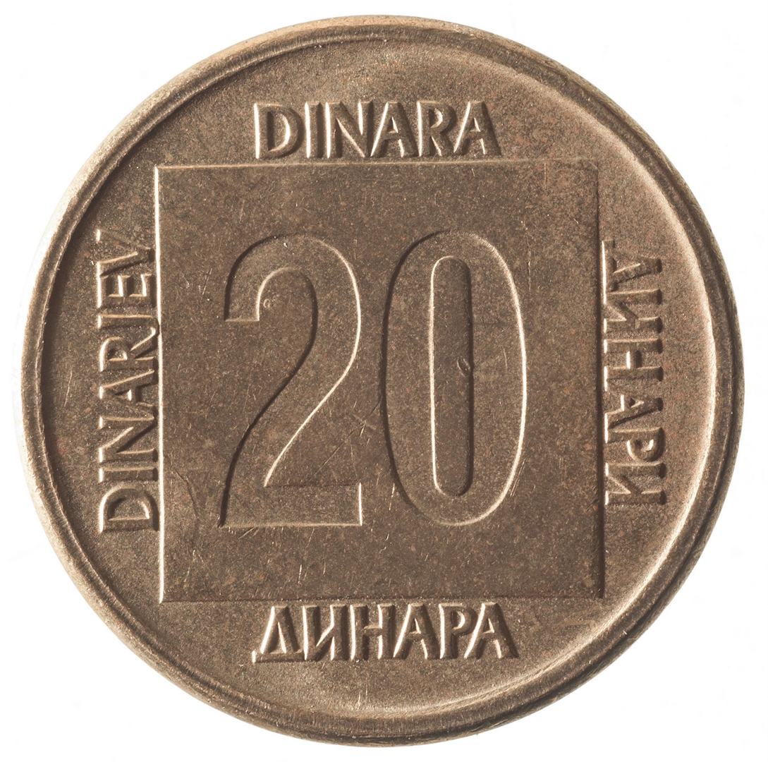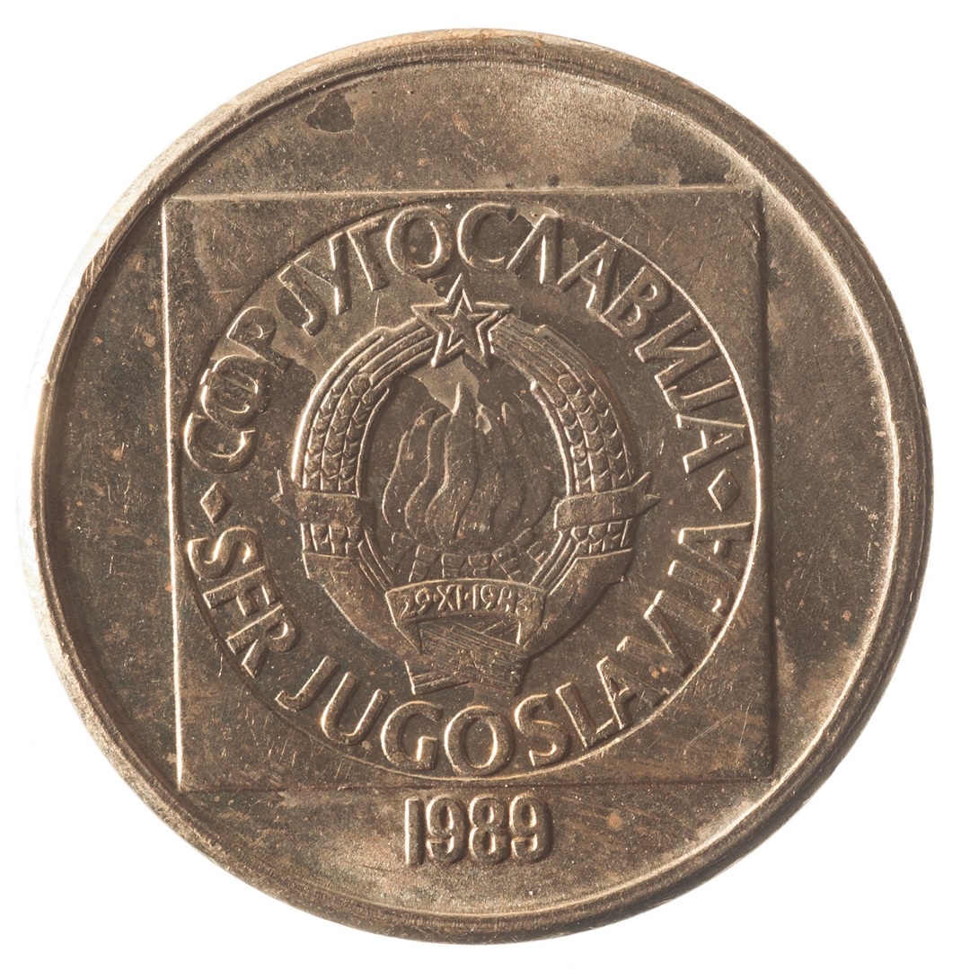 Avers: U sredini unutar četverokuta državni grb, a oko njega uz rub polukružno napisan tekst SFR JUGOSLAVIJA na latinici i ćirilici. Ispod godina 1989. Revers: U sredini četverokuta broj 20 (nominala), oko njega tekst DINAR na četiri jezika.