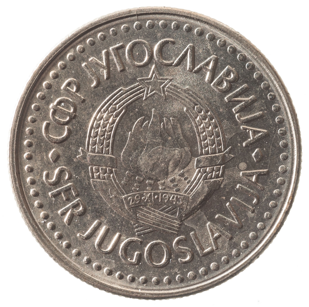 U sredini državni grb. Oko njega uz rub polukružno napisan tekst SFR JUGOSLAVIJA na latinici i ćirilici.