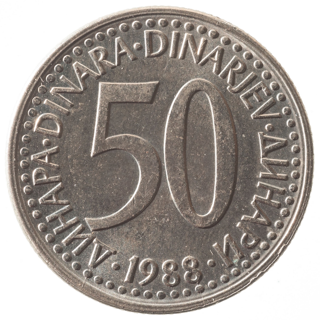 U sredini broj 50 (nominala), oko njega tekst DINAR na četiri jezika, a ispod toga godina 1988.