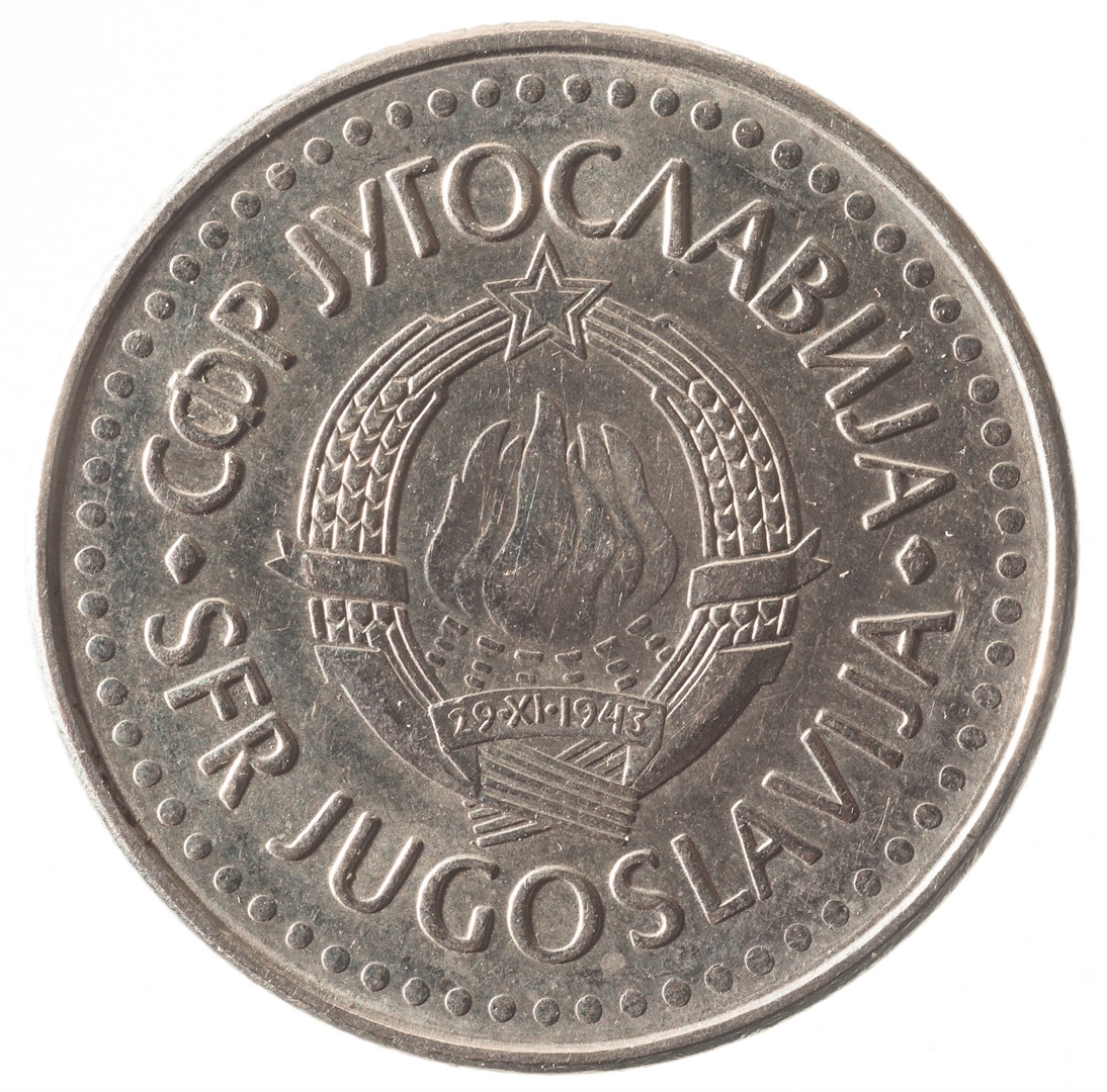 U sredini državni grb. Oko njega uz rub polukružno napisan tekst SFR JUGOSLAVIJA na latinici i ćirilici.