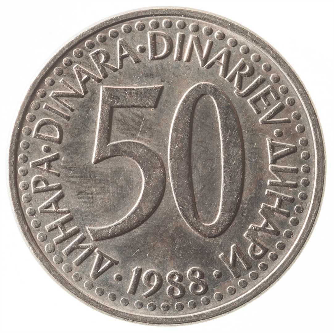 U sredini broj 50 (nominala), oko njega tekst DINAR na četiri jezika, a ispod toga godina 1988.