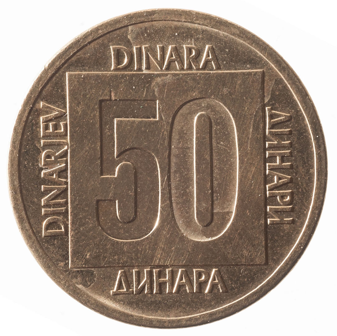 Avers: U sredini unutar četverokuta državni grb, a oko njega uz rub polukružno napisan tekst SFR JUGOSLAVIJA na latinici i ćirilici. Ispod godina 1988. Revers: U sredini četverokuta broj 50 (nominala), oko njega tekst DINAR na četiri jezika.